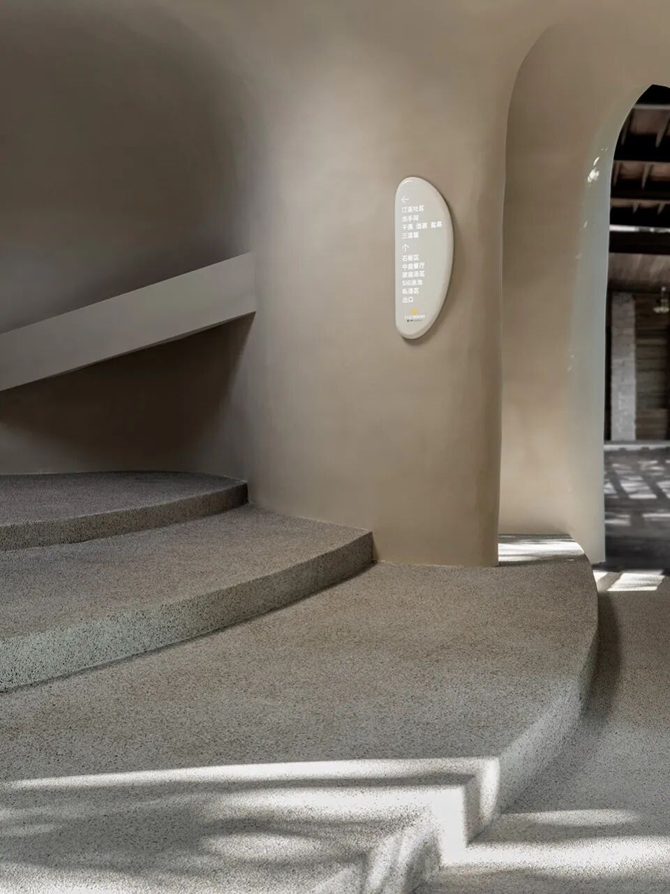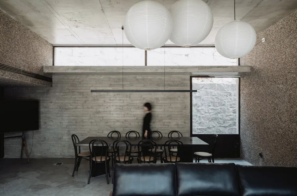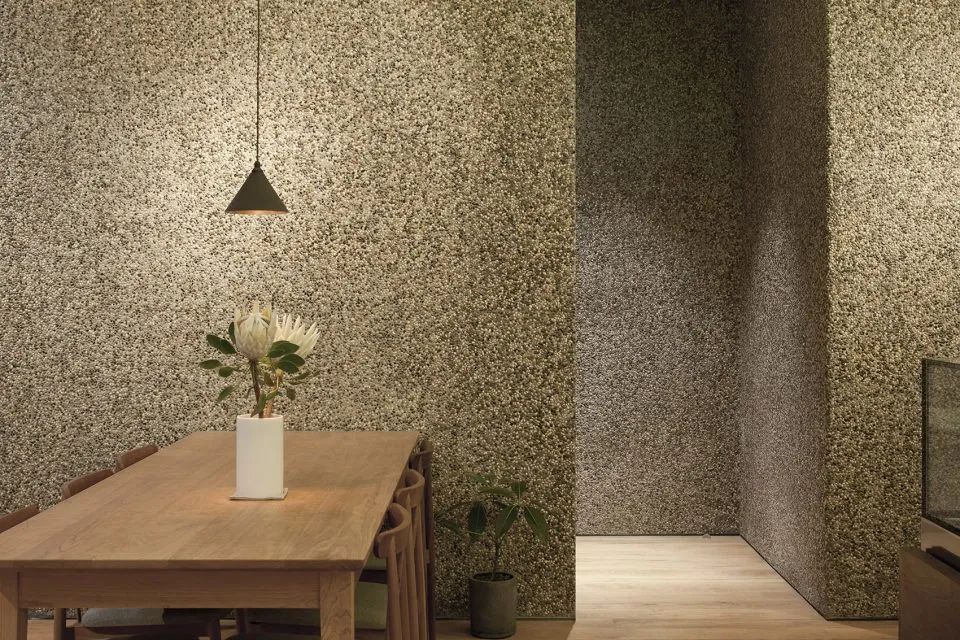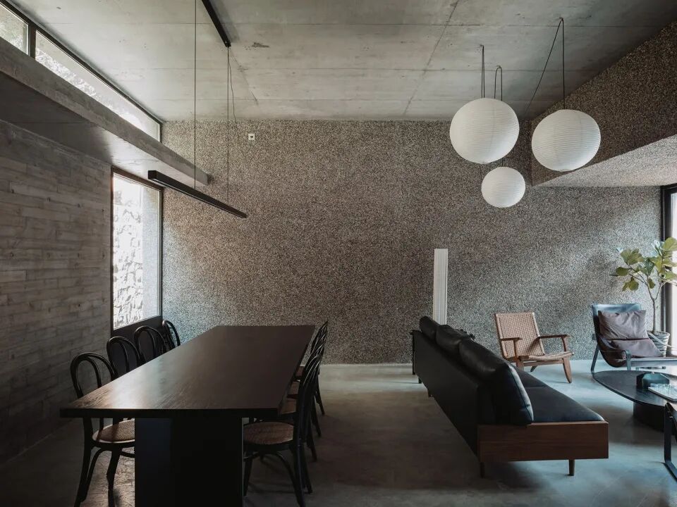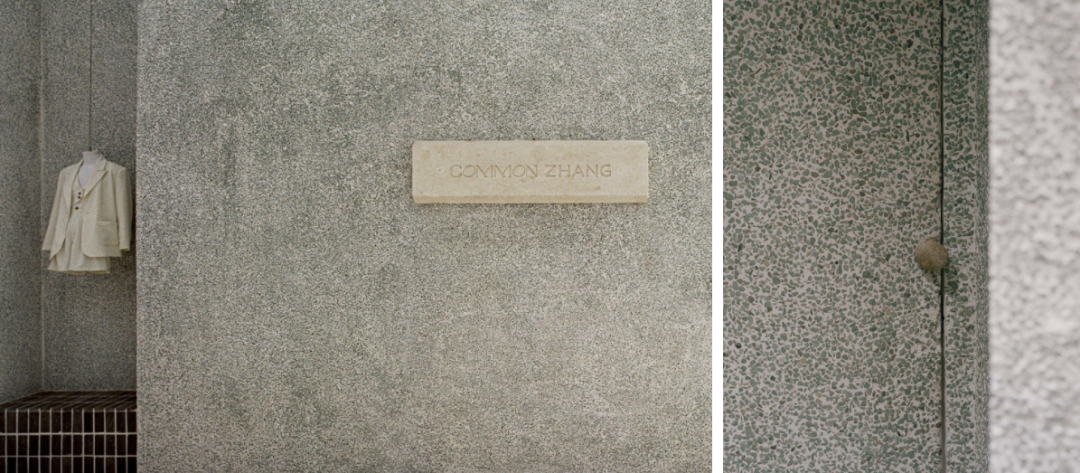 墙体是夹杂了鹅卵石的水磨石,地面材料是混合了灰色石粒的水洗石,两者虽然颜色相似,却有着截然不同的质感肌理。