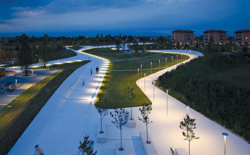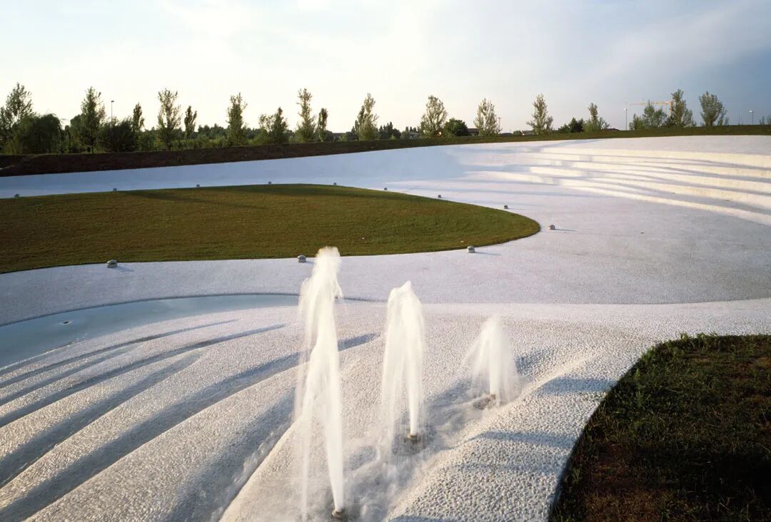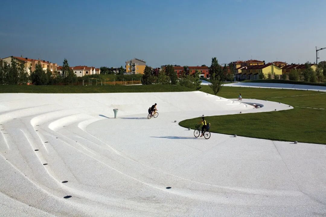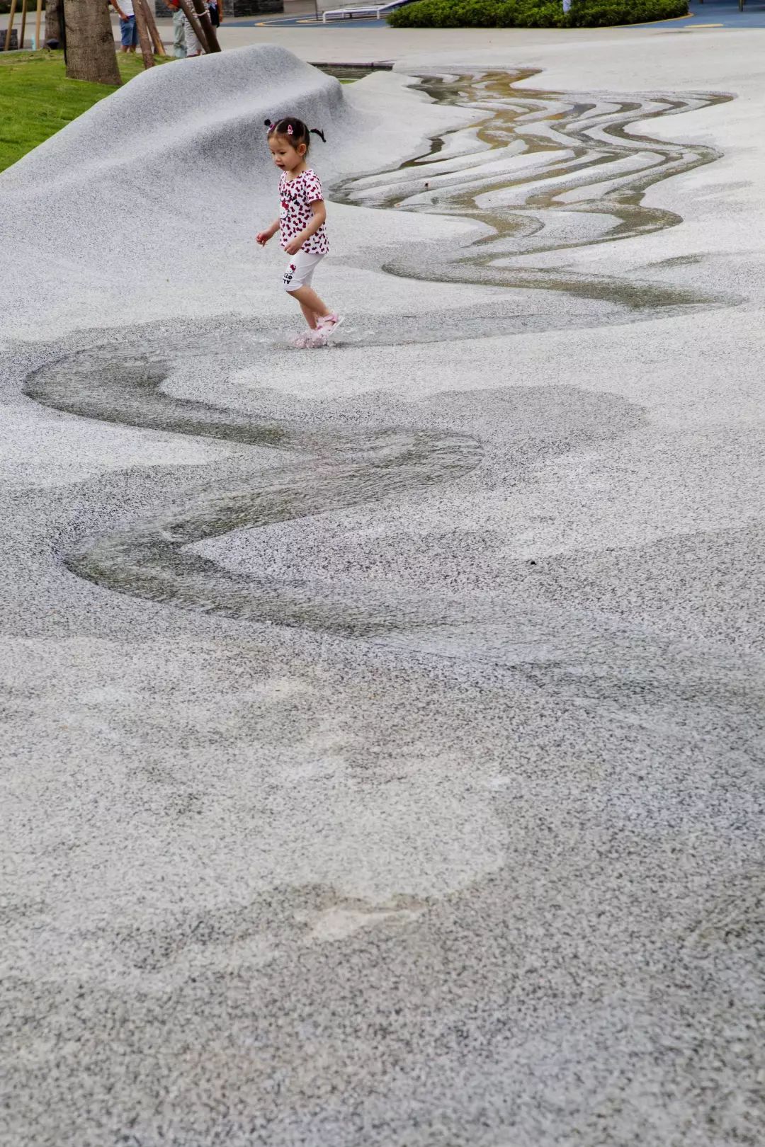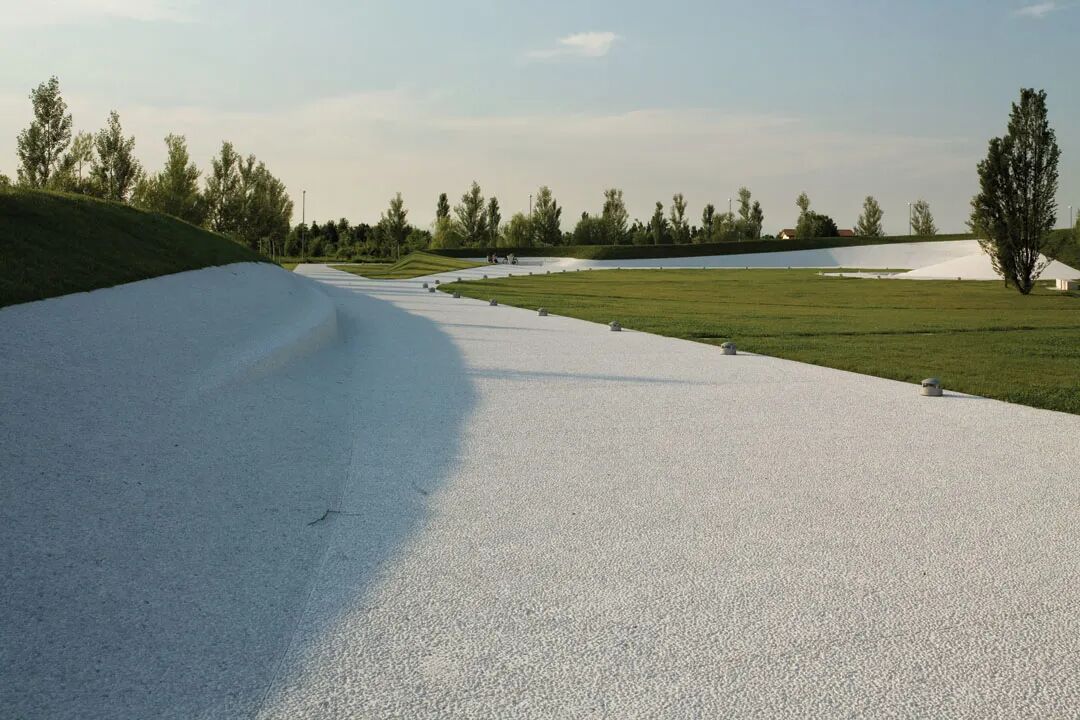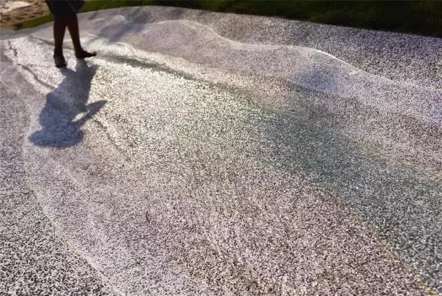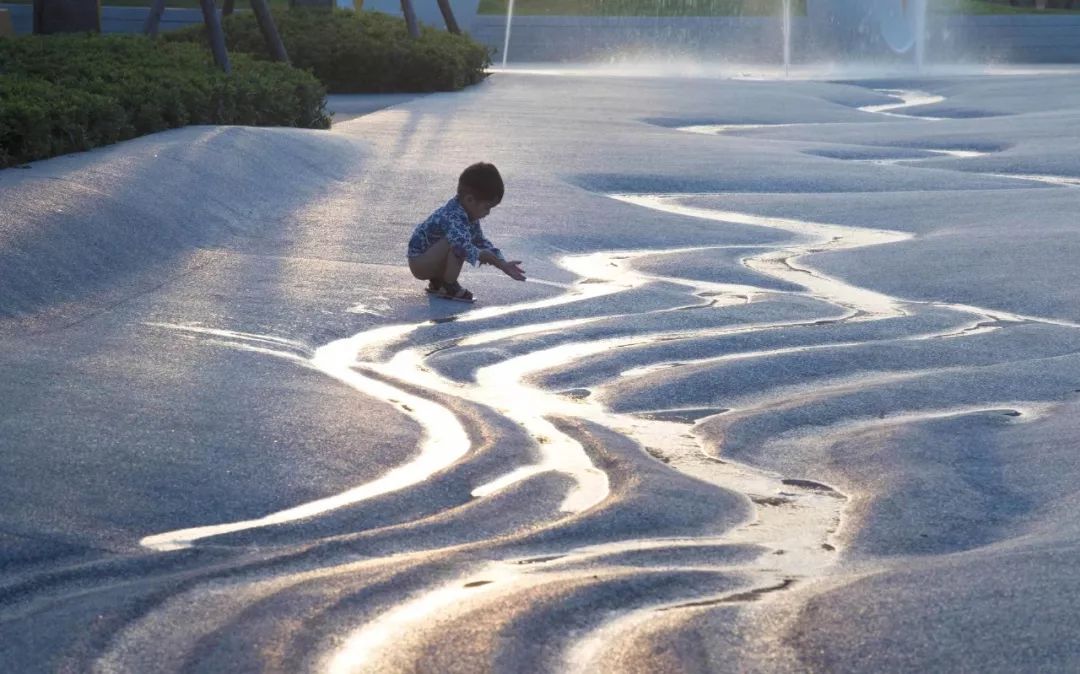 社区公园的南部面向主要公路,内部的铺装是白色的水洗石,这白色的铺装如同自然地貌般起伏着,形成小山,盆地,在不同的季节为人们带来不同的小气候。