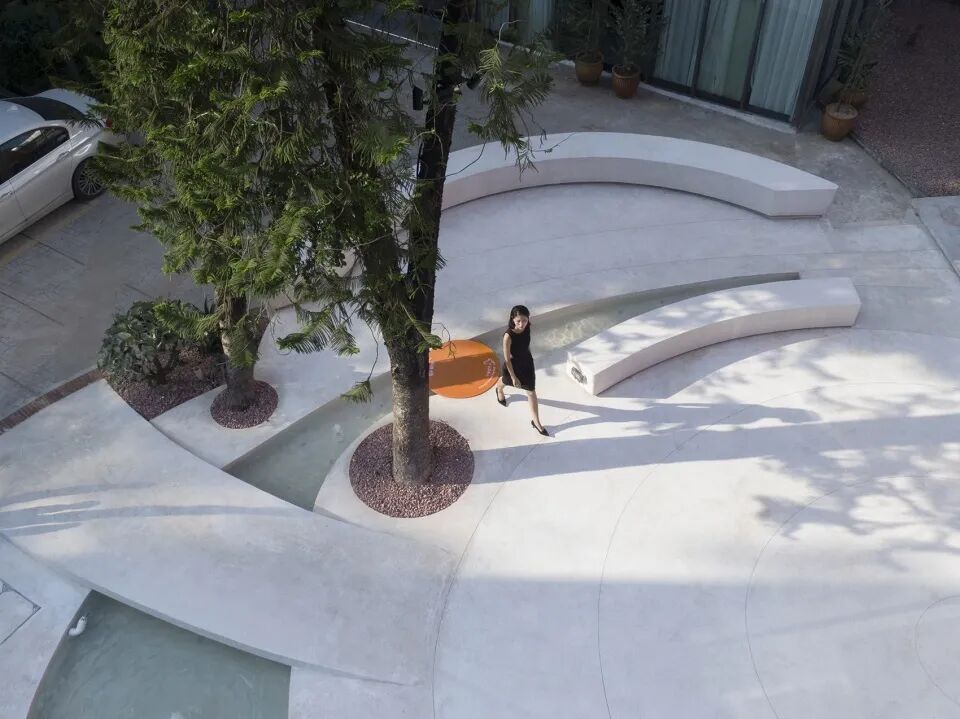 这个椭圆形的花园用白色水洗石做地坪,用红色水洗石做舞台地面。创造了一个无边界且保留了现场的乔木的椭圆形白花园。
