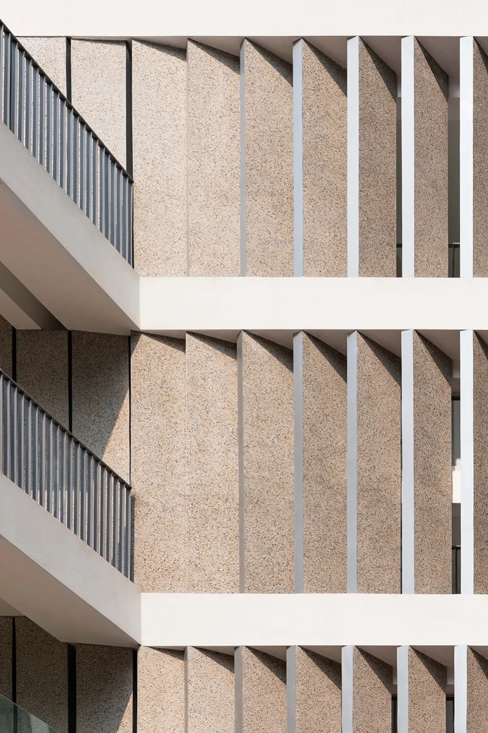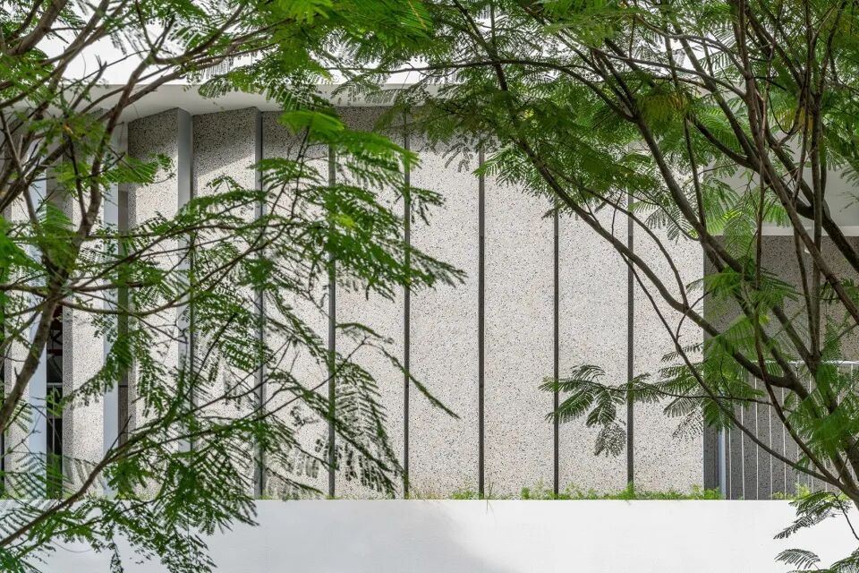在立面的呈现上,设计以体现材料的原真性,构造的经济性作为出发点,选择采用水刷石作为主体材料。这种完全手工的施工方法带来细腻原始的质感,灰黄调的天然质感石子肌理与周边玻璃幕墙和钢筋混凝土的现代建筑形象形成柔和的对比与互补,焕发着自然的生命力。