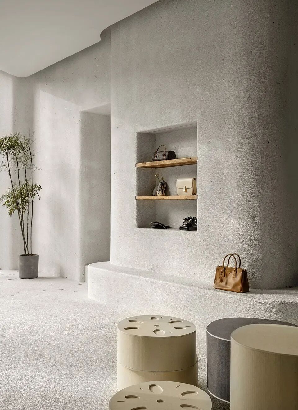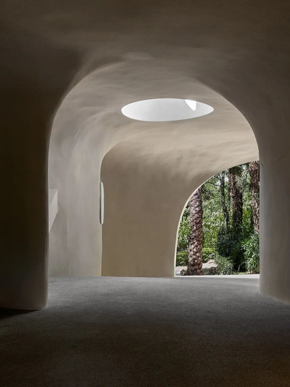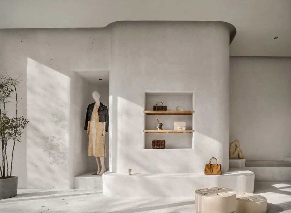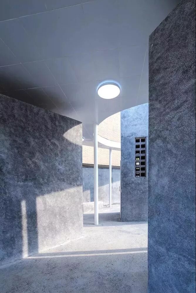 以入眼粗粝的水洗石地面奠定基本调性,而白色材料唤起的暧昧性联想,令人置身如花园天井这样的户外场景,内与外的模糊,消除了事物的边界,空间浮现出一种迷幻气质。