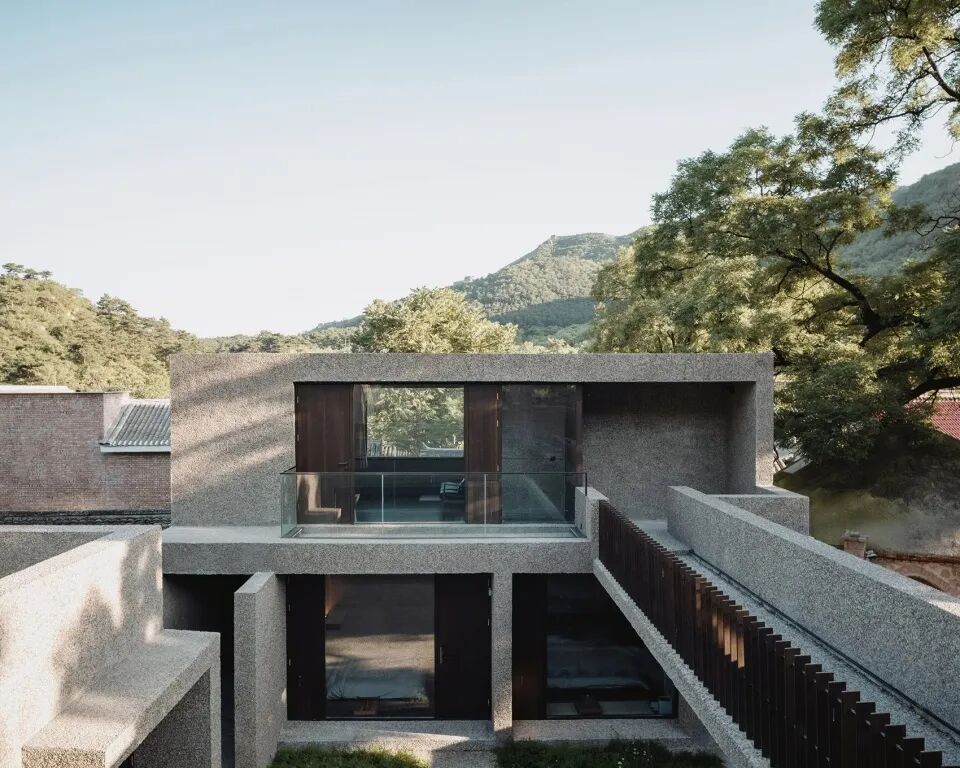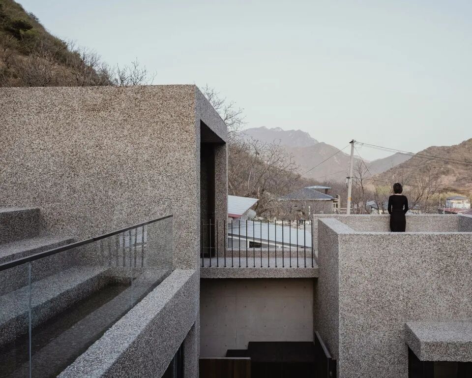 作为室内外主要的饰面用材,水刷石从鹞子峪古堡的建筑遗迹里浮现出来, 从室外到室内,从地面到墙体再到天花,一种材料表达了它可以表现的最大化,并强调了建筑向来不是特立独行的个体,它是与场地融为一体的、不突兀却有着独特性格和面貌的“芸芸众生”