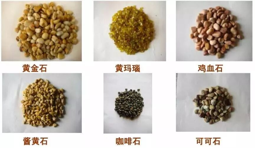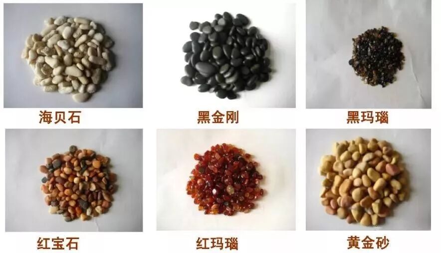 常用天然水洗石按材质和颜色的不同有以下品种:三宝砂、水晶米黄、太行灰、五彩砂、 黄金石、绿芝麻、彩绘石、港澳石、海贝石、黑金刚、鸡血石、可可石等。