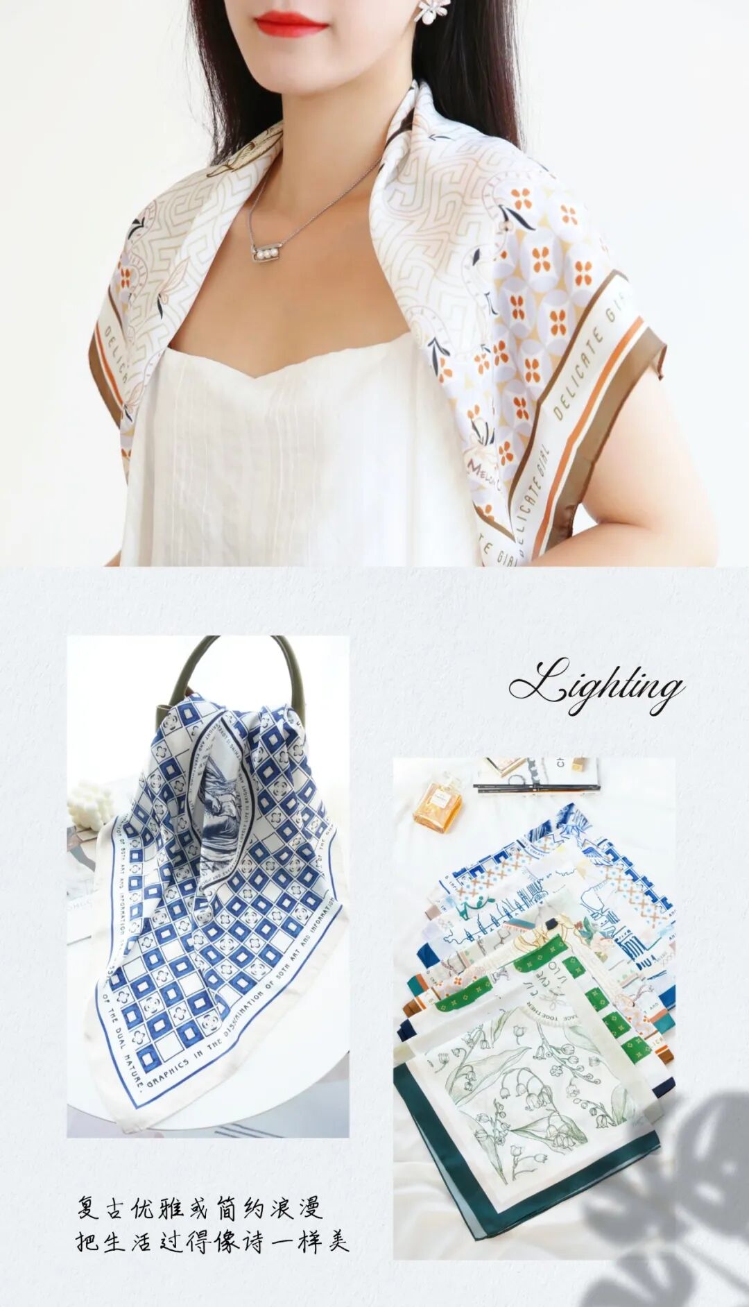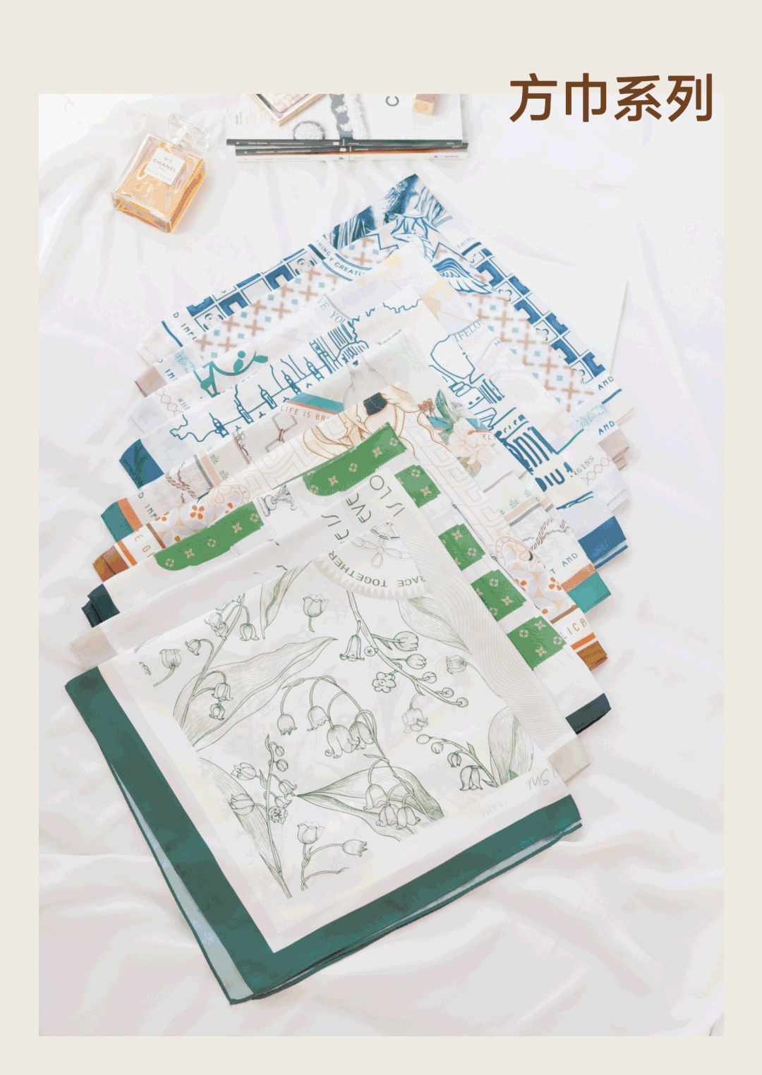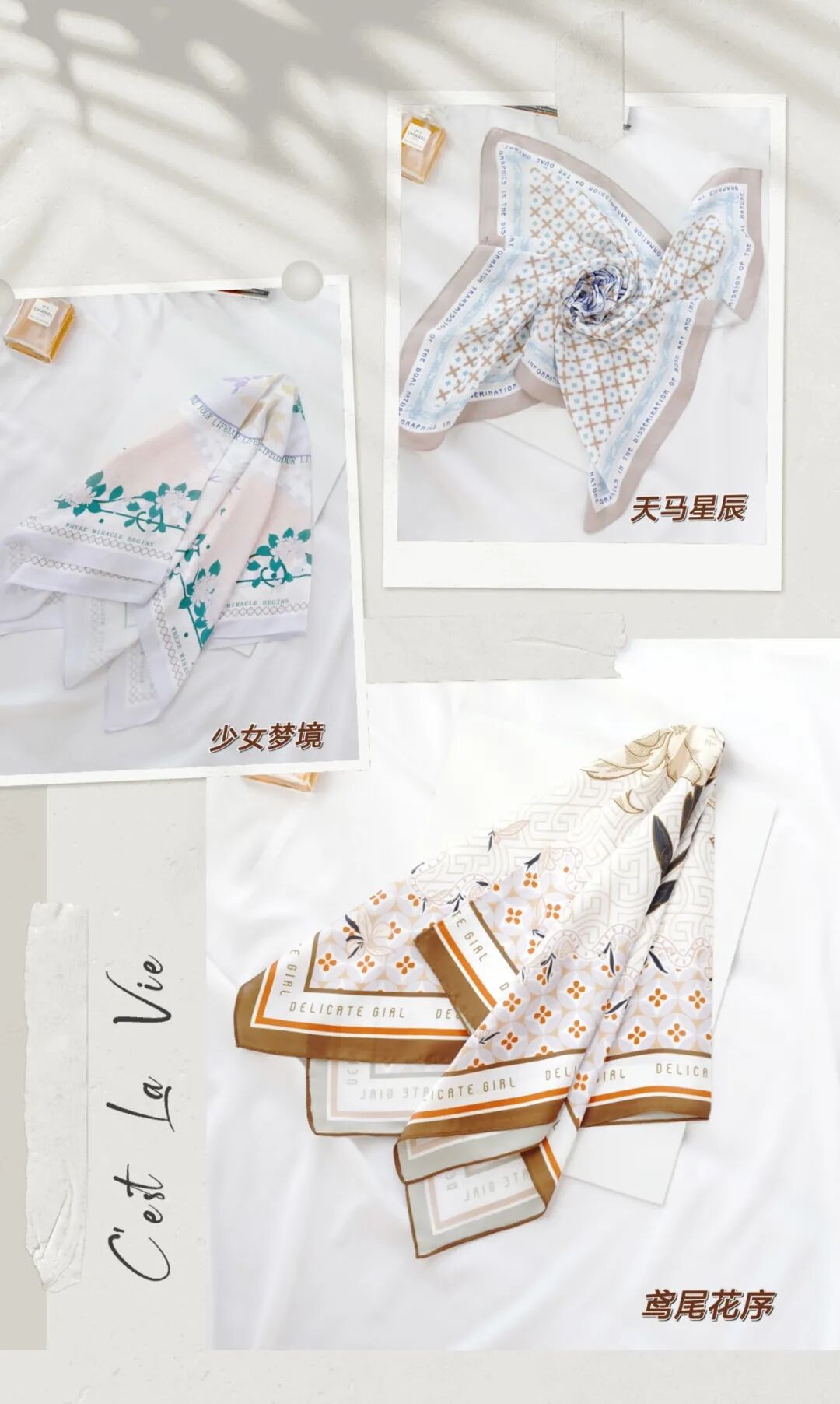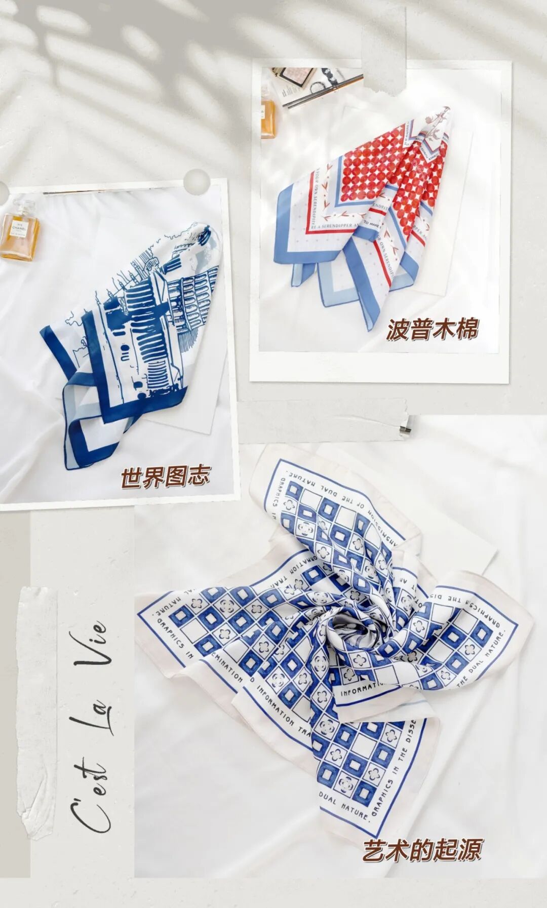 丝巾图案均为设计师原创,艺术不失品位,防真丝的柔软舒适,可复古优雅、简约气质,亦可青春少女,在方寸间把生活过得像首诗。