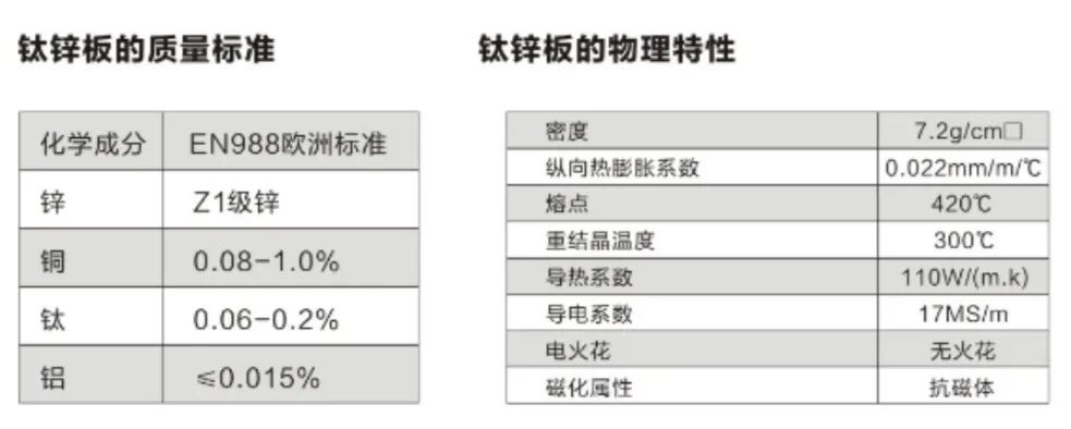 由高纯度的Z1级别的金属锌与少量的金属钛(约0.06~0.2%)、金属铜(约0.08~1.0%)及金属铝(约≤0.015%)熔炼而成合金,经辊轧处理成片、条、板或卷状的建材板。