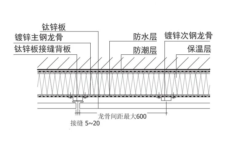 此系统为传统钛锌板安装系统,采用单锁或双锁重叠后立边,通常墙面用单锁边。