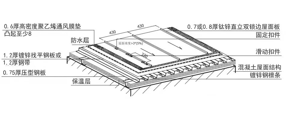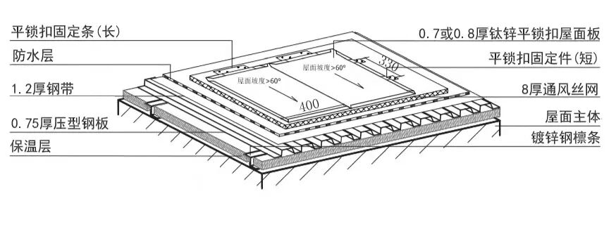 此系统为传统钛锌板安装系统,采用单锁或双锁重叠后立边,通常屋面用双锁边。