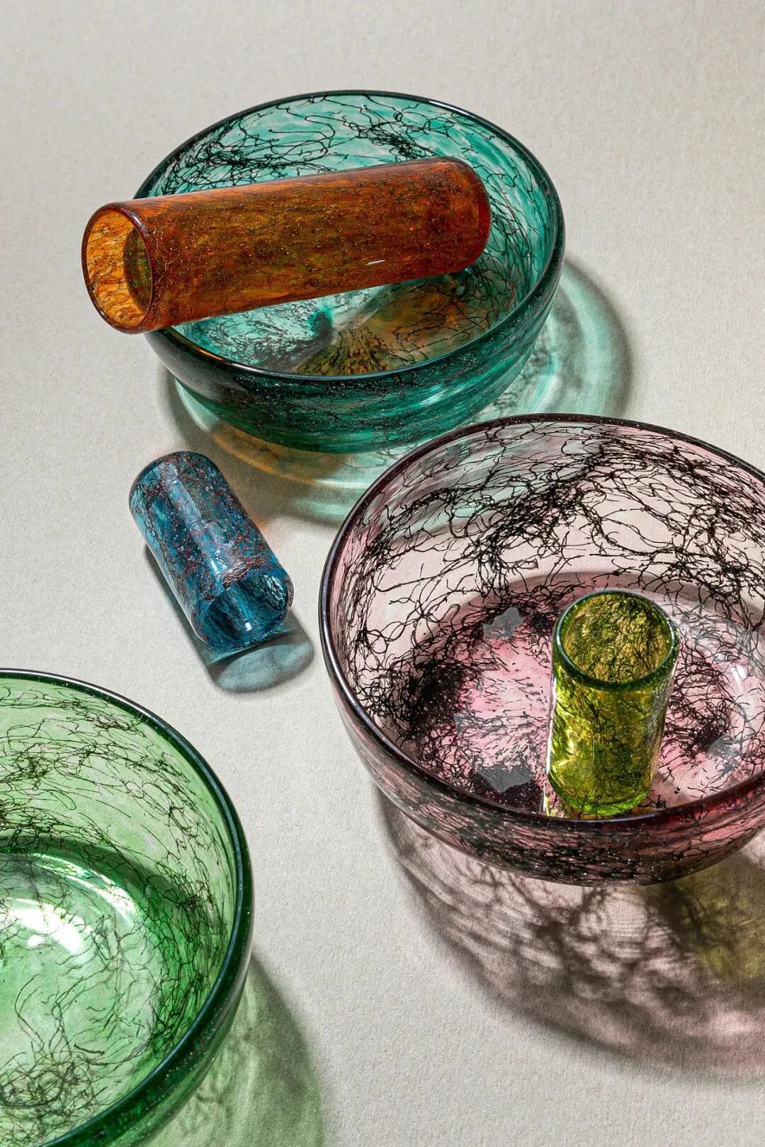 玻璃与可回收的金属线和粉末结合在一起,收获新的质感,从而得出这个一系列的玻璃器皿。
