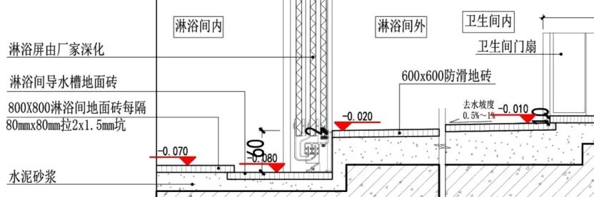 如果需要门槛石,门槛石一般跟门套宽度相同,门槛石材质一般是大理石,卫生间门槛石节点如下: