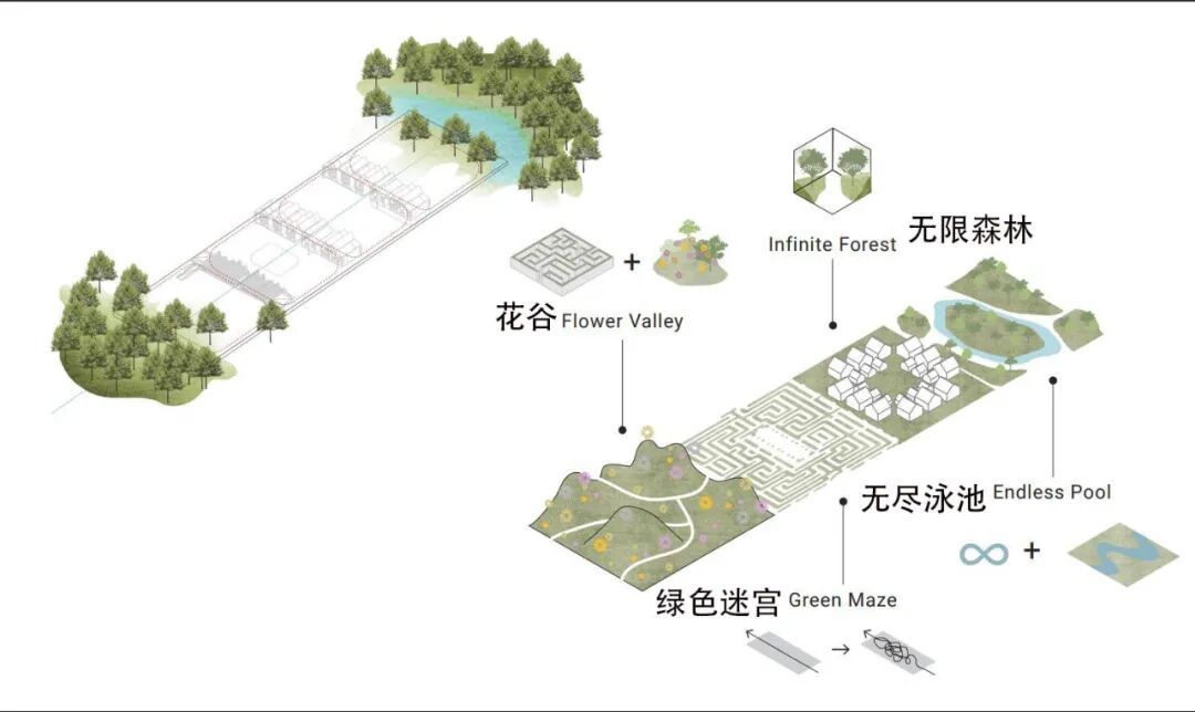 第三个区域是无限森林,这里有一条狭窄的人行道,两侧都是高高的灌木墙,穿过别墅群,通向区域中间的镜子迷宫。沿途是对称的蜿蜒走道,并用反光墙包围,营造出无限走道和空间的错觉。迷宫会令游客们惊叹,为他们提供在神秘森林深处发现秘密基地的体验。