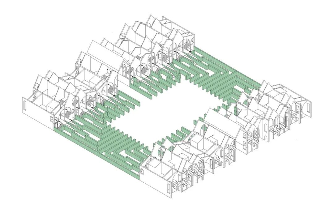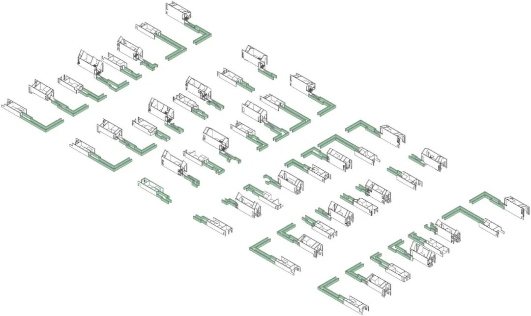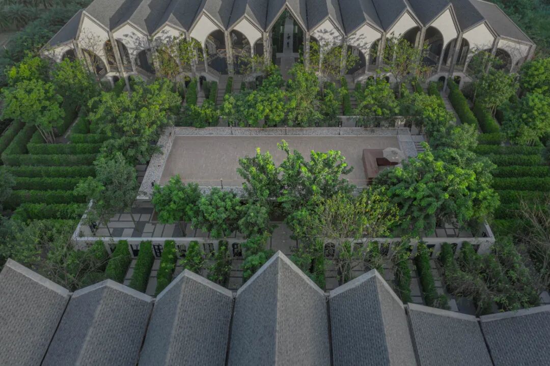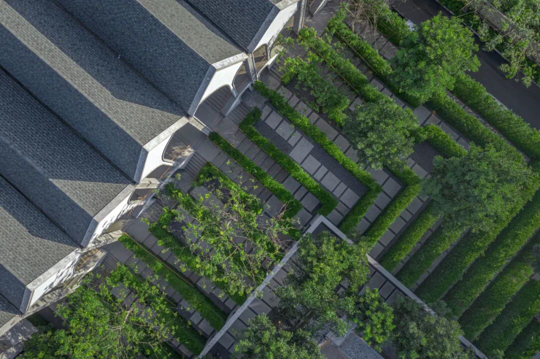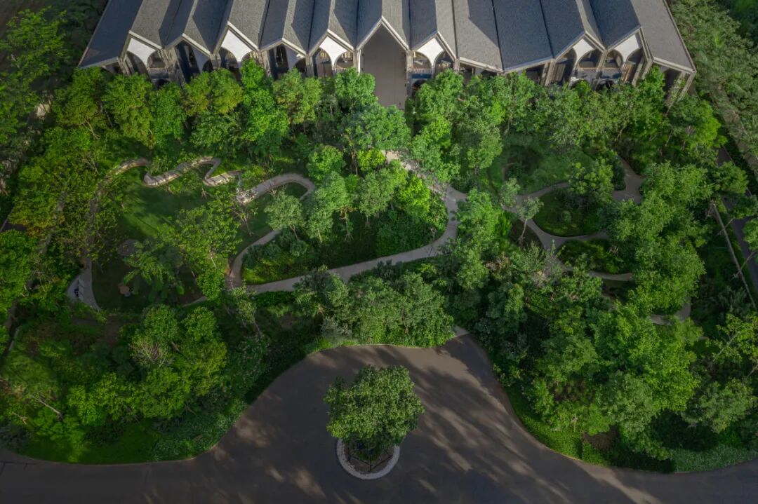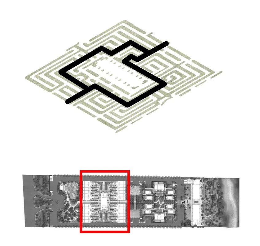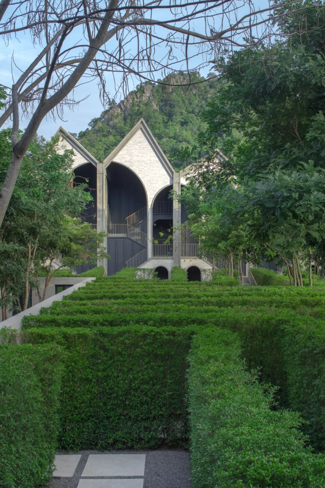 “花谷”区的旁边是第二个区域“绿色迷宫”,它由接待大厅,酒店楼和绿色迷宫组成。植被迷宫引领客人们从接待大厅到他们的房间,增添通道的深度和层级,以及途中的乐趣,这个过程就像通向城堡之旅一样。此外,迷宫通道分别通往不同的房间,为客人们提供了更多的隐私。