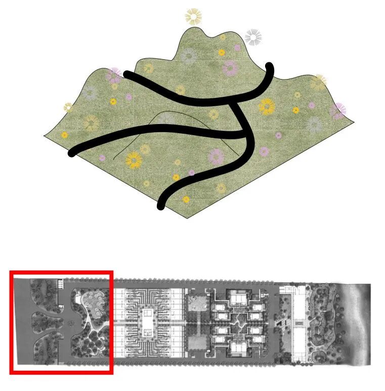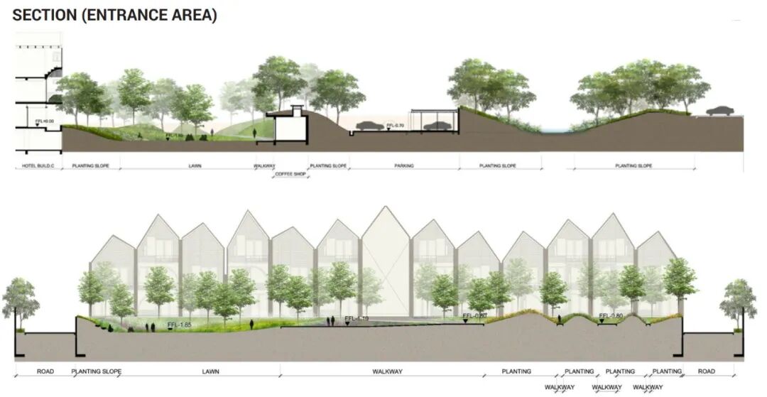 A road cutsthrough natural scenery and leads to the project that has no border structureand seamlessly connects with surrounding nature. The project’s frontage area,The Flower Valley zone, consists of flowery mounds maze with winding walkwaysgo in-between. The maze is a natural border separating the frontage zone thatis open for public and the inner zones reserved for resort guests. The 2-3meters high mounds also visually shield the project area from outsiders. A caféis hidden under a mound like a fairy underground house. In front of the café,lies a lawn catering for events or activities, such as concert or wedding party.At a corner of the zone, a playground is hidden among the mounds maze,surrounded by seating area for parents to get relaxed while watching over theirkids.