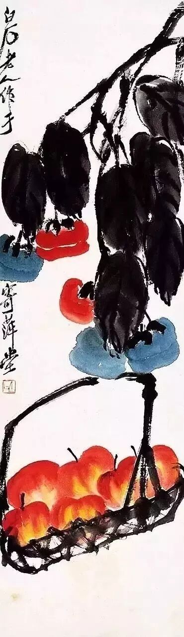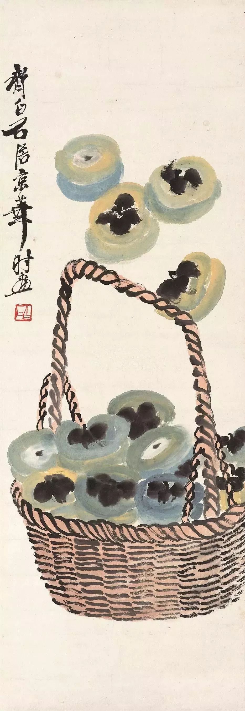 齐白石的《六柿图》,六个柿子巧置於篮中,设色朴雅,心静意清,用笔憨态纯厚,带有浓重的乡土气息,自然而天真,极富有意趣。