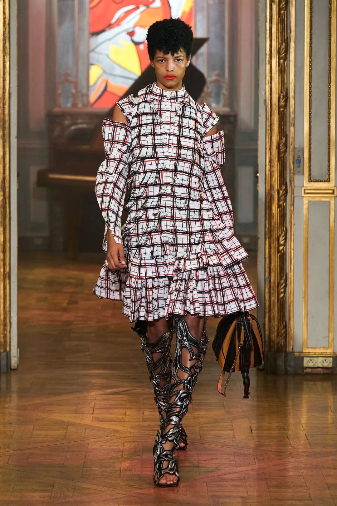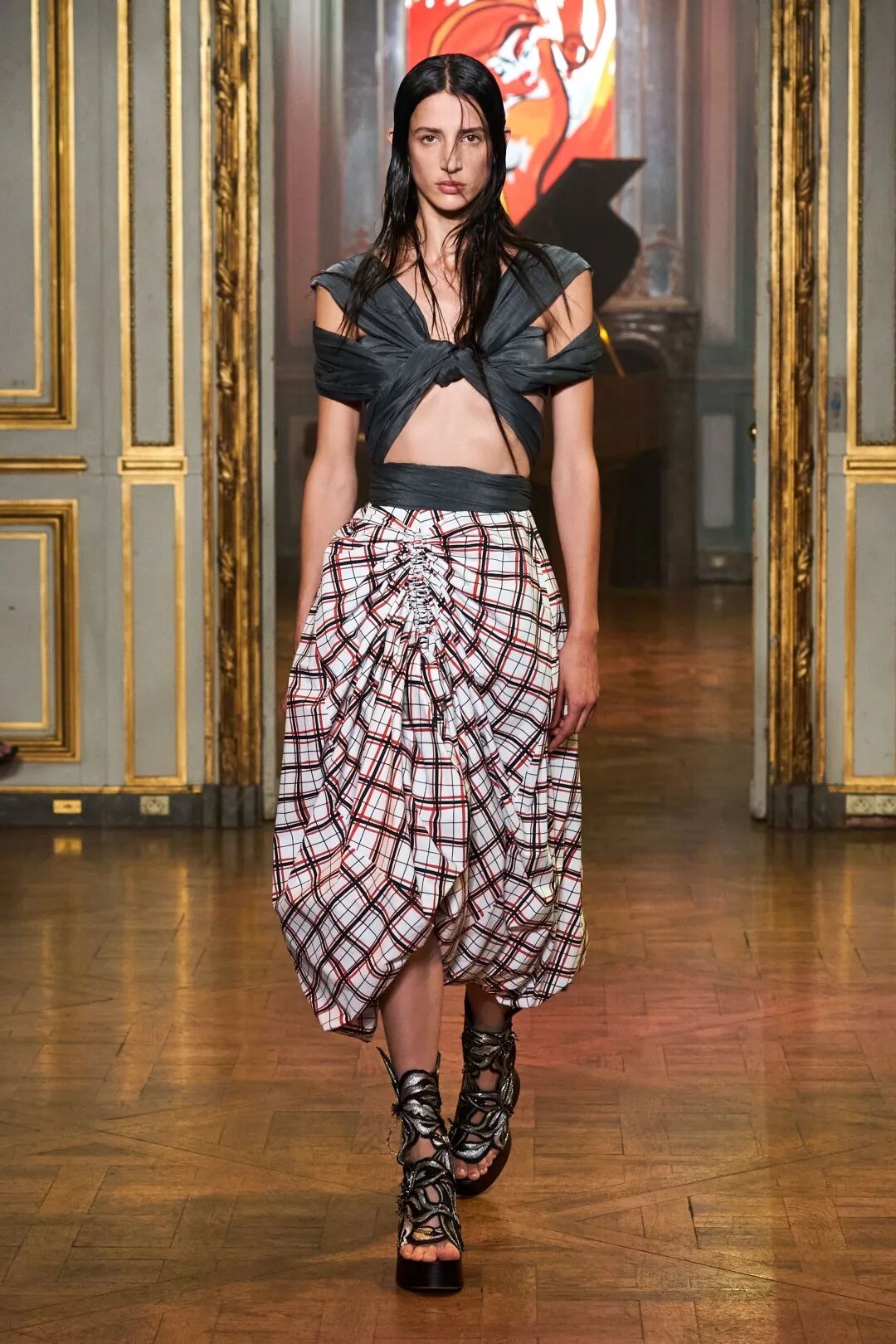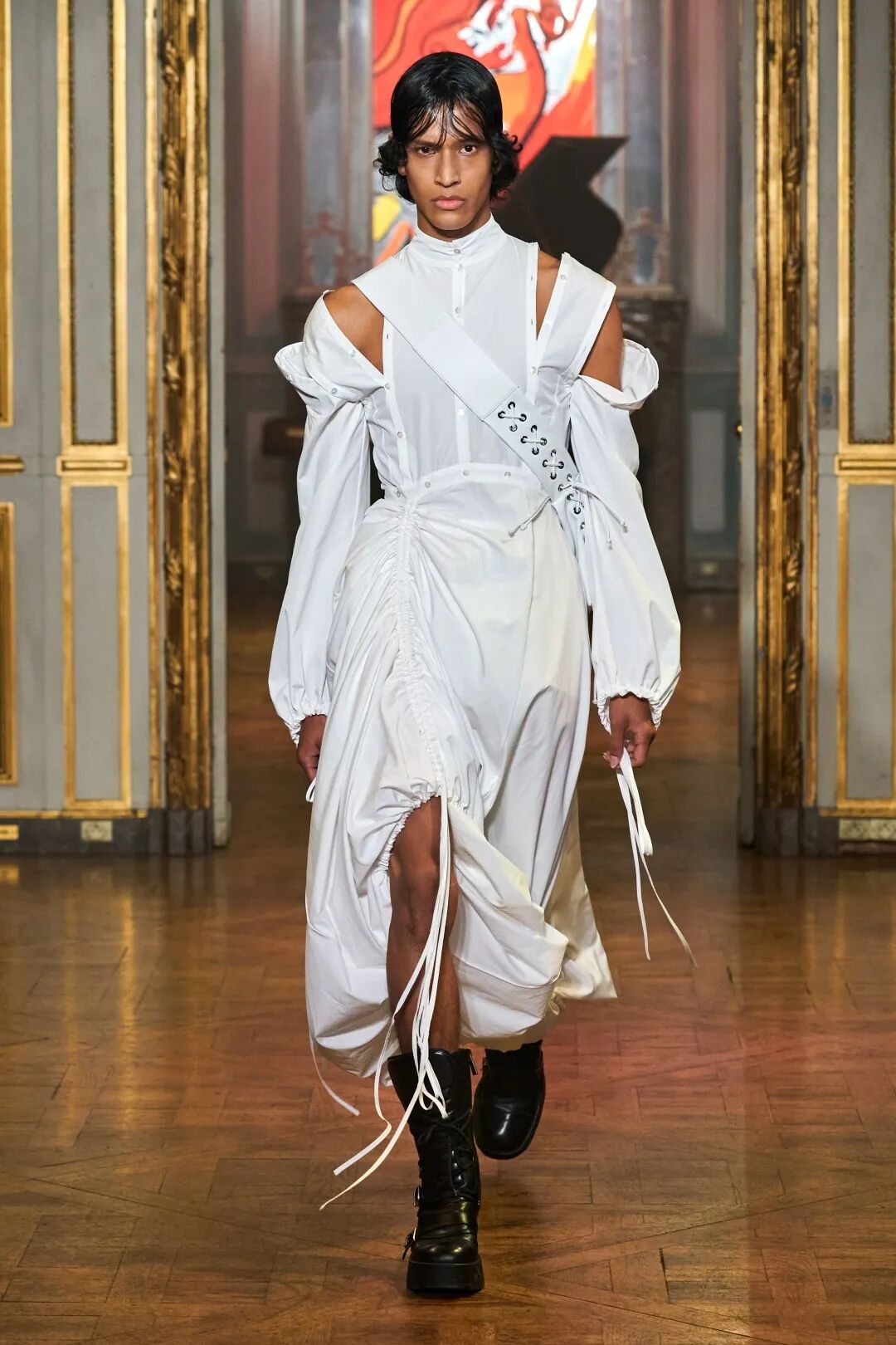 切割的衬衫裙与细绳创造出的不对称的空间,让服装看起来具有体量感。Charles de Vilmorin设计的服装与他的艺术作品一般,都富有极大的不羁与张力。