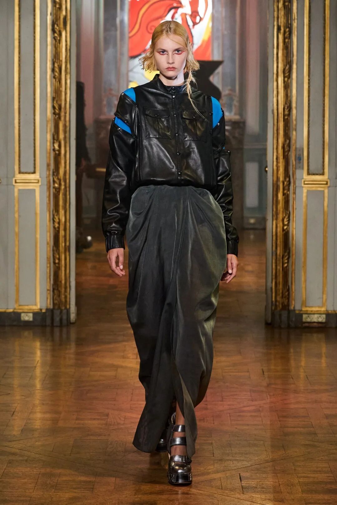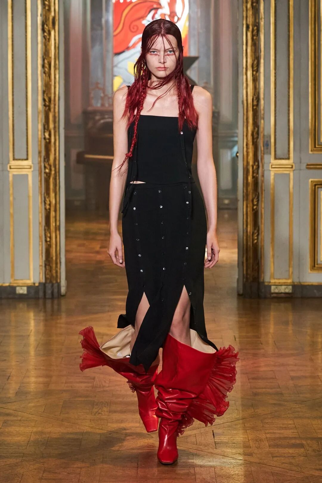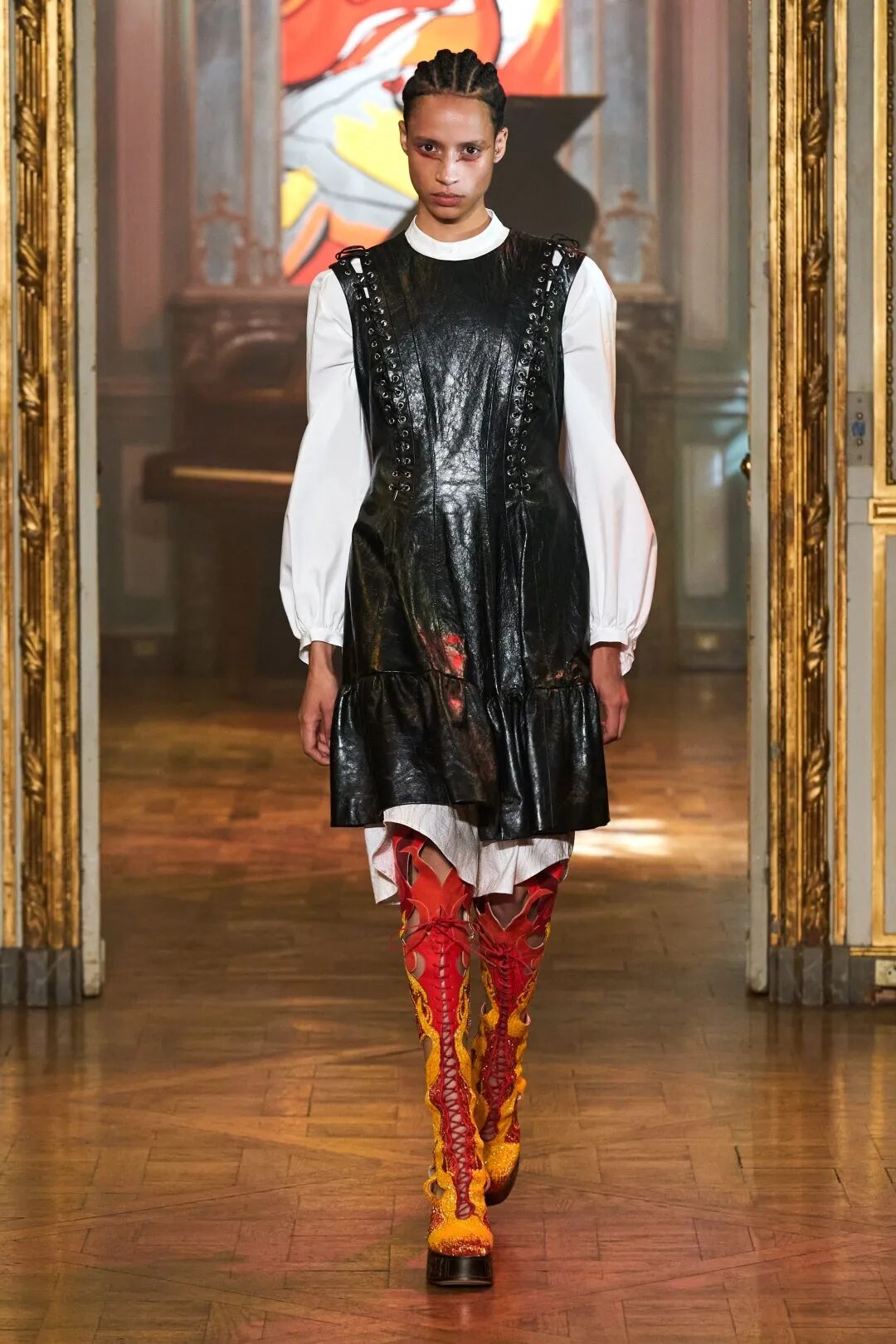 切割的衬衫裙与细绳创造出的不对称的空间,让服装看起来具有体量感。Charles de Vilmorin设计的服装与他的艺术作品一般,都富有极大的不羁与张力。