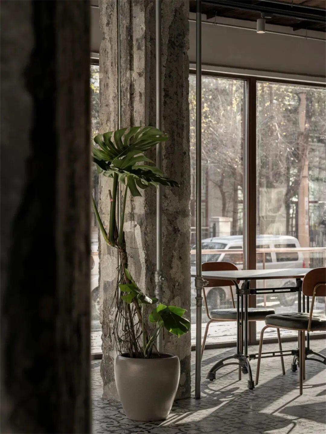 进入空间后映入眼帘的是开放式的吧台和厨房区域,在入口的左侧是餐区,分为长桌、卡座区和散桌三部分。客人透过餐区能看见尽头的花艺区,在花艺区有单独的开门,实现独立进出。