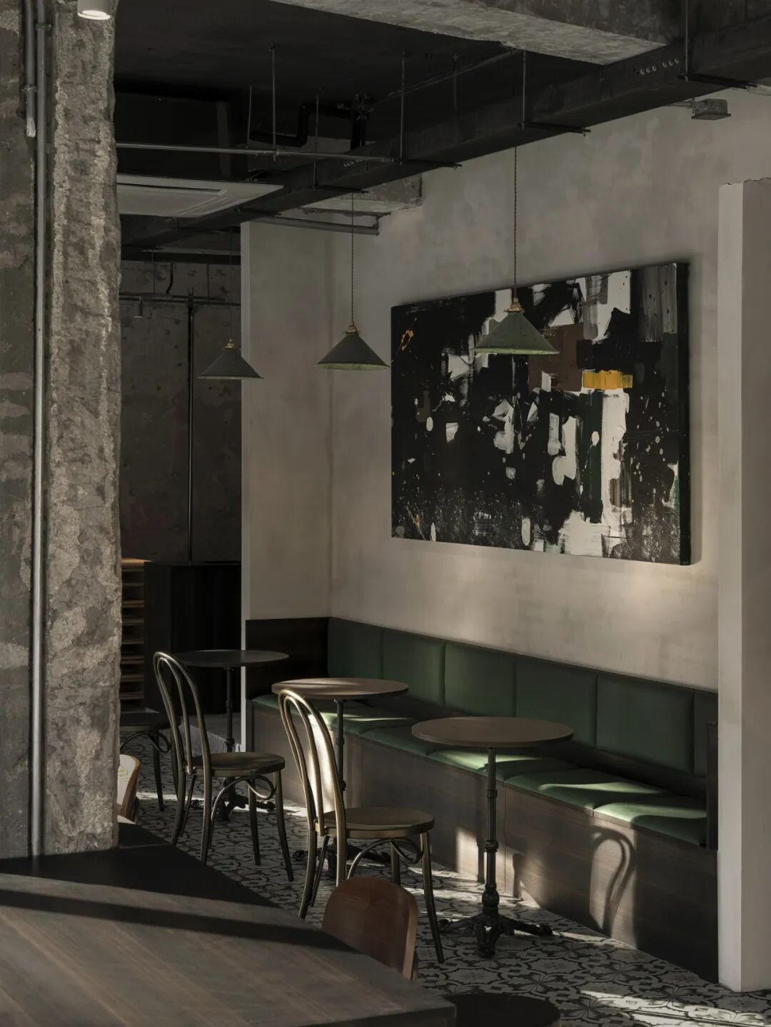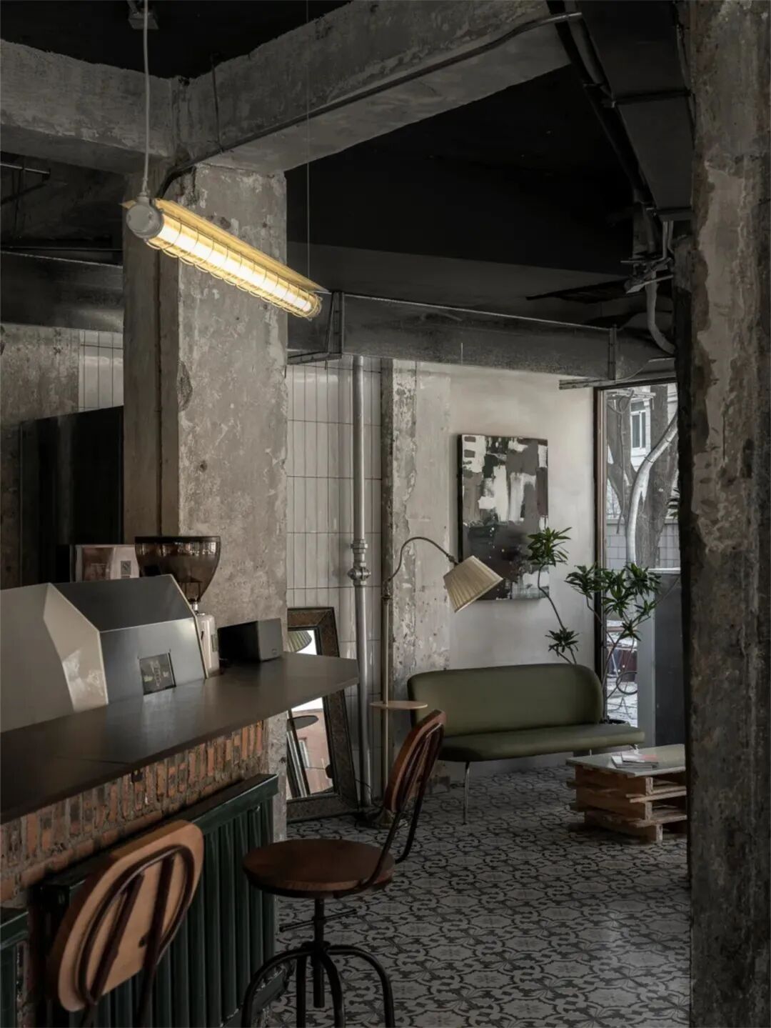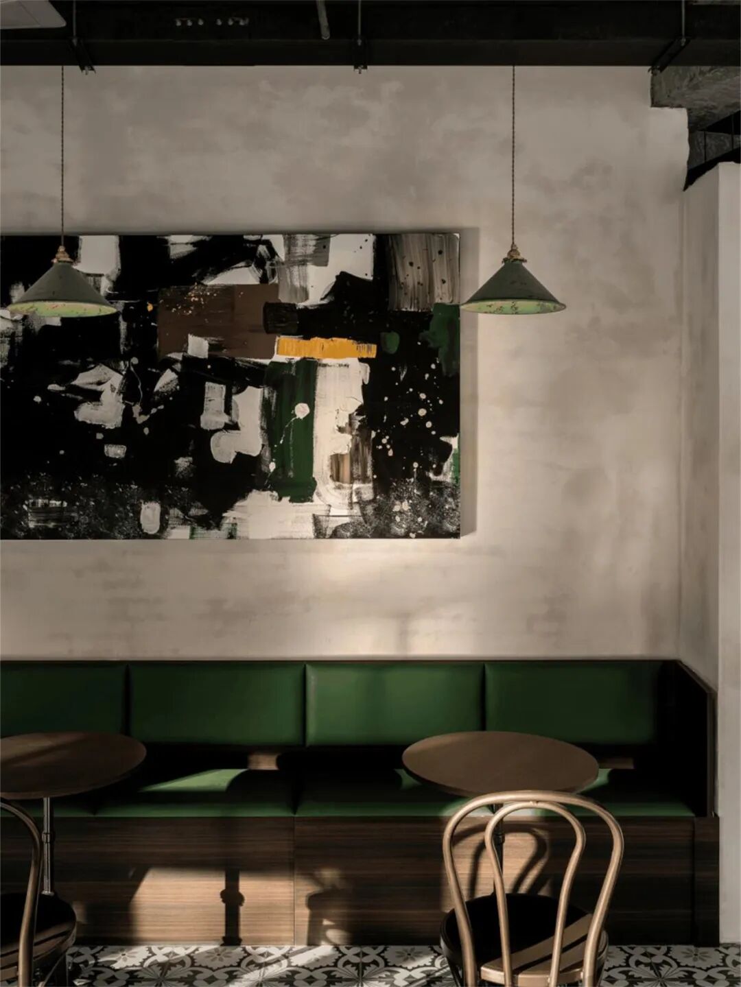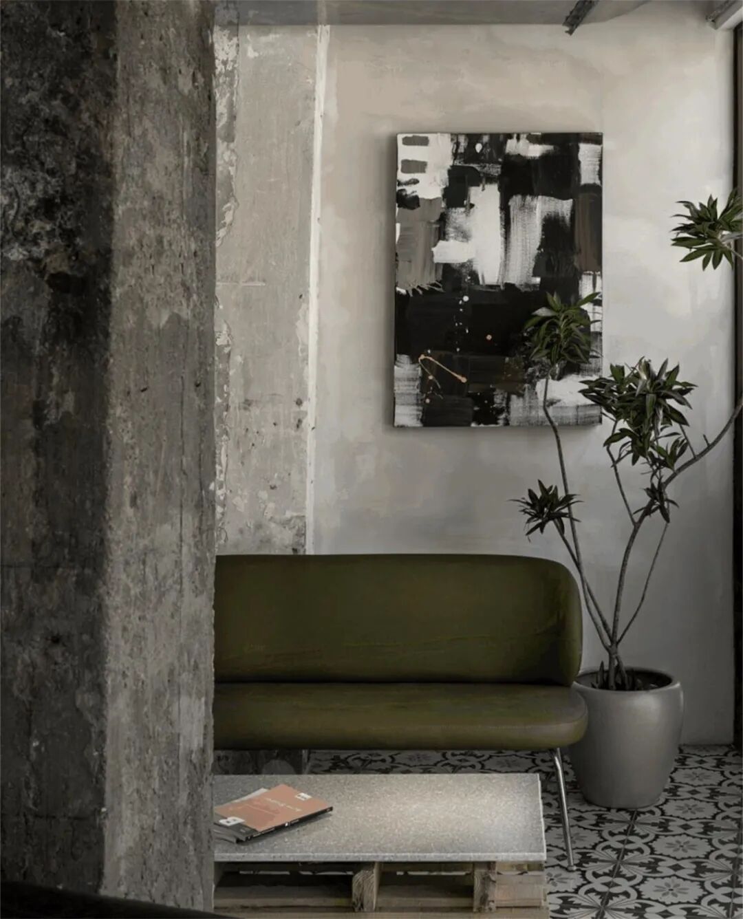 空间选用绿色、棕色作为主观颜色贯穿,绿色与棕色带给人复古美式的即视感,同时也是生机与自然的颜色。我们从原始痕迹的选择,到空间内的墙地面材质,再到定制、家具、艺术品、软装,统统遵循主线颜色的把控,使得最终呈现整体且联动。在配色的层层框架之下,色彩的张力蔓延到空间。