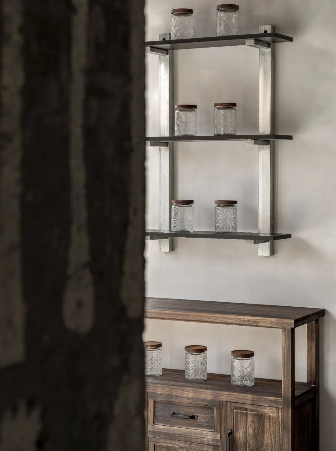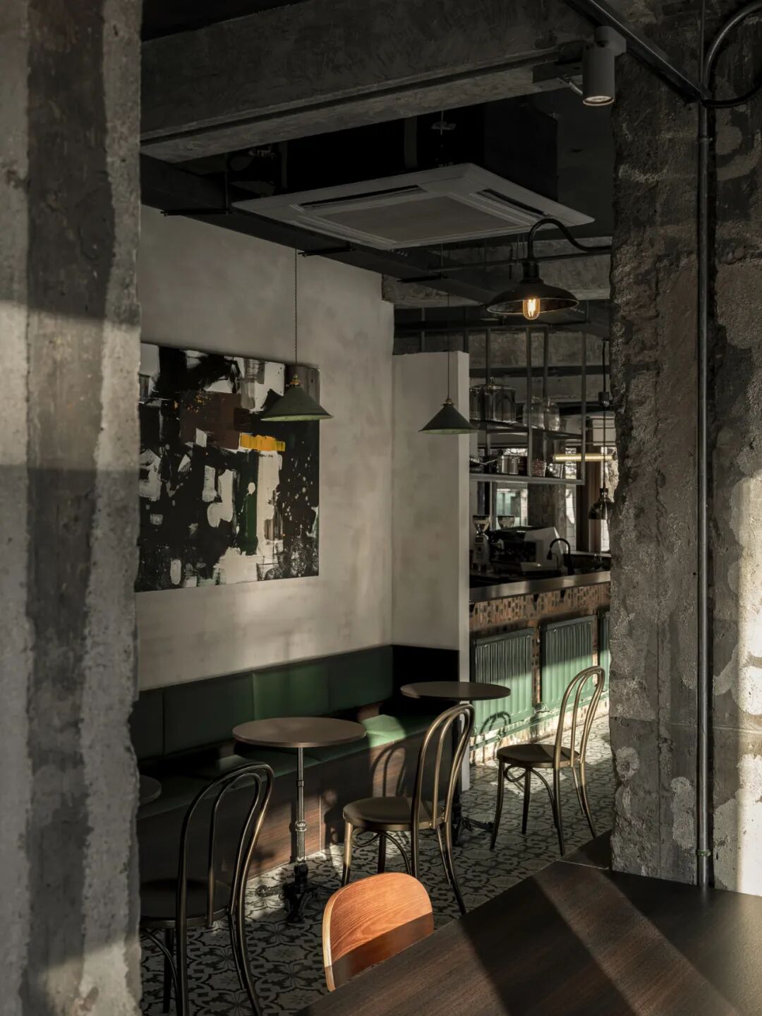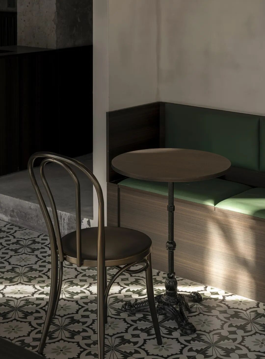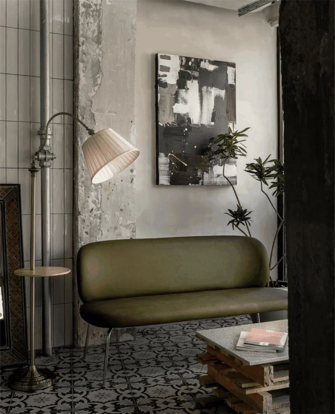 空间选用绿色、棕色作为主观颜色贯穿,绿色与棕色带给人复古美式的即视感,同时也是生机与自然的颜色。我们从原始痕迹的选择,到空间内的墙地面材质,再到定制、家具、艺术品、软装,统统遵循主线颜色的把控,使得最终呈现整体且联动。在配色的层层框架之下,色彩的张力蔓延到空间。
