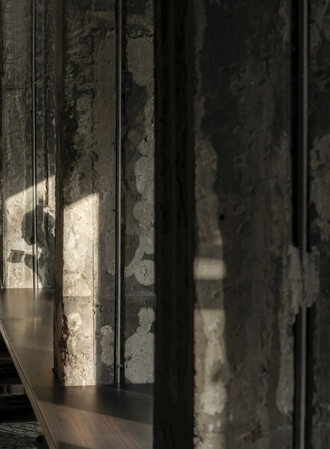 我们在该项目的设计中对原始建筑状态进行了选择性保留。我们保留了原始扩建的钢结构和木板做为空间生长变迁的印证,并且在空间中运用同样的金属色和木色,塑造呼应关系。通过长桌的植入,不仅保留了原始空间的痕迹,还消隐了过多柱子带来的阻隔感。