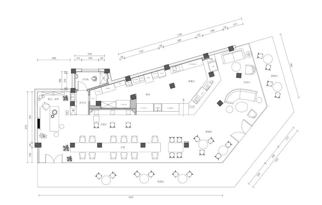 空间平面原始状态是不规则的,且柱子之间缺少对齐逻辑关系。我们在设计中根据柱的分布,结合用餐的感受,巧妙地划分出了不同功能区,并且使其在空间中和谐交融。