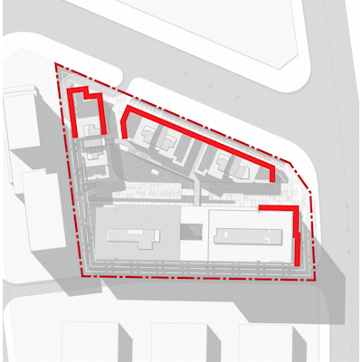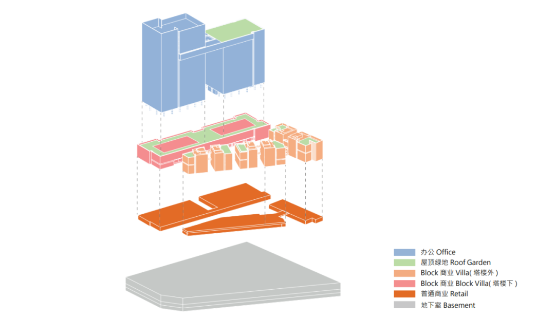 遵循“有限空间业态最大化”的设计理念,建筑自上而下垂直布局包含办公、屋顶绿地、空中会议、商业、地下室等多功能业态,通过空中会议层形成塔楼之间的彼此连接,满足当下办公会议需求,形成促进交流的活力空间。设计结合地块梯字型的特点,围合出一个环境优美、尺度宜人的城市广场,通过东西南侧开口设置,与周边地块建立紧密联系,为市民和来访者营造出自然开放的社交空间。