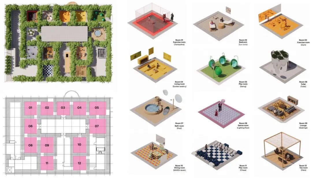 到达顶楼,游客会看到一片绿色的竹子景观,里面充满了各种设施和活动,形成一个竹子“迷宫”,将屋顶划分成不同的空间,每个空间都提供不同的使用功能:包括用于表演和活动的玻璃盒子,也有各种休息区、健身房、蹦床、秋千、茶馆、餐厅、舞池和象棋。这个屋顶使该项目在生态和社会方面更具可持续性,竹子创造了一个凉爽、阴凉的空间,并在密集的城市环境中丰富了生物多样性,而活动室则为原本相对拥塞的城中村提供了社交和休闲空间。
