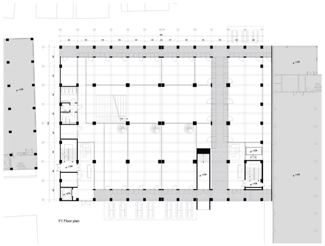Rather than demolish and rebuild, the design sustainably renovates a disused factory building, maintaining a piece of Nantou’s history while also having lower embodied carbon emissions than a new building. The building’s original structure has been strengthened so that an extra floor could be added on top to maximise floor area. Meanwhile, the original façades have been removed, with the building’s concrete frame exposed and preserved to show traces of the building’s history. The new façade is set back from the edge of the structure, creating open loggias that wrap around the whole building. These allow for circulation and enable the chance encounters with colleagues that make for a dynamic creative environment.