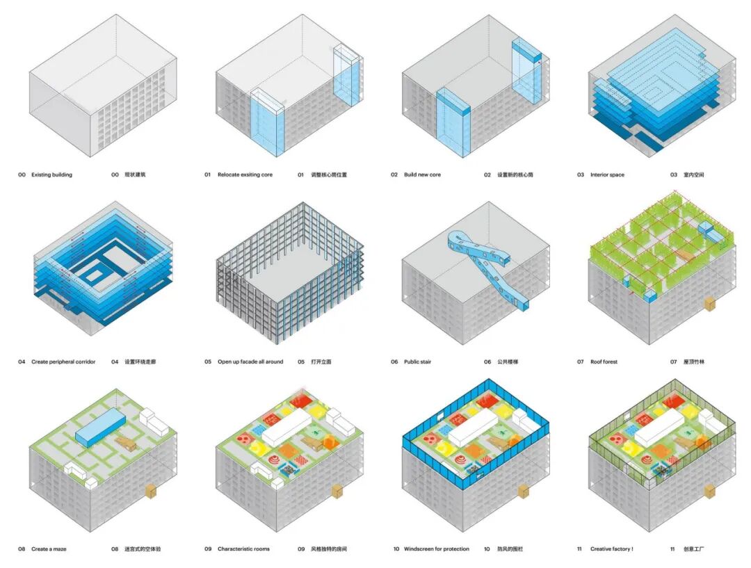 “if工厂”前身是深圳南头城中村内的一座服装工厂,MVRDV从可持续的角度对该厂房进行了改造再利用,将其打造成一座“创意工厂”,作为万科城市研究院的办公大楼,同时也用于其他办公租赁。该建筑是具有公共特质的,MVRDV在建筑内部植入了一条贯穿上下六层的大型楼梯,能够通过楼梯直达屋顶,屋顶外墙由竹子围成,分隔出多样的活动空间,提供各种设施和活动。