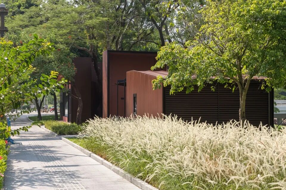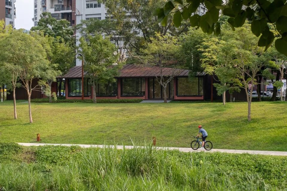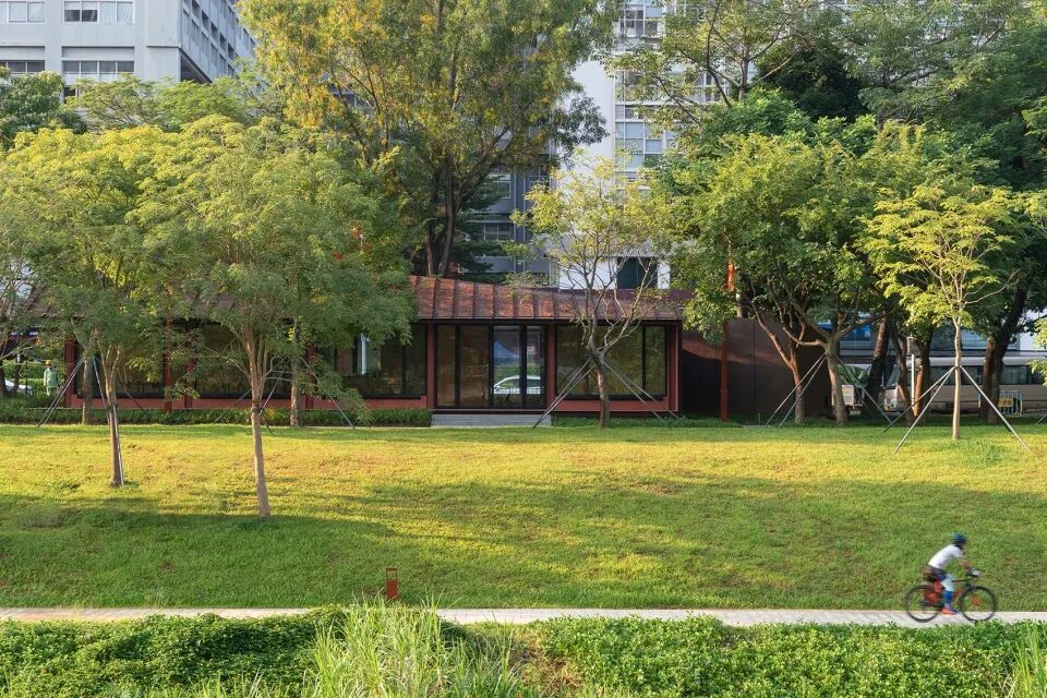 大沙河驿站的设计是一个命题作文,项目从起始就面临了两个挑战:一个关于场地,一个关于文化。首先,项目位于一片已经完成的公园绿地之中,是新增的便民服务设施。虽然我们可以在一定范围内自由选择建筑的落位,但是场地内相对密集的树木以及严苛的树木保护政策极大地限制了用地选择。其次,作为一个市政配套项目,在项目开始之前,“岭南建筑”这一主题便已确定。对我们来讲,如何用当代的建筑语言来回应一个传统的命题,也成为了项目的另一个挑战。