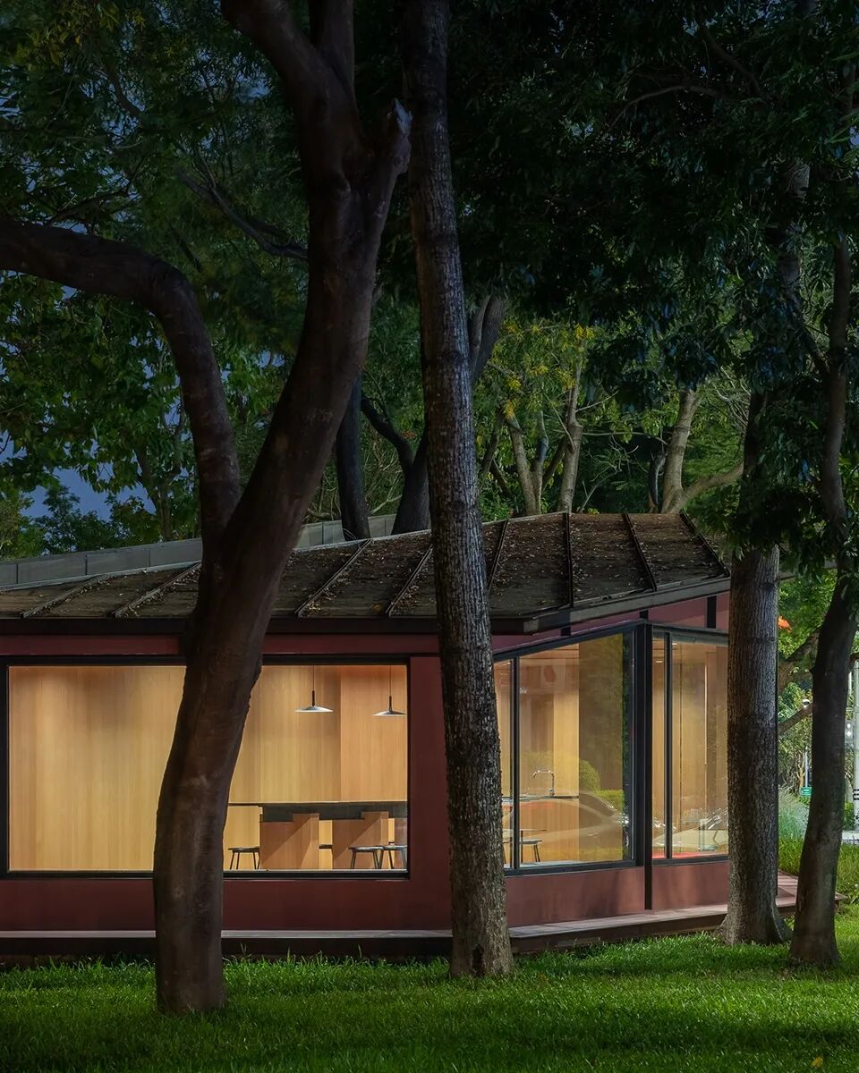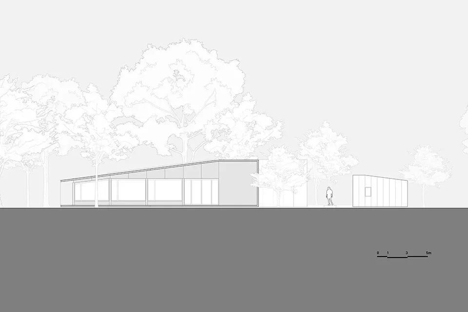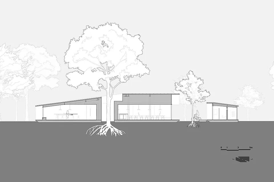 建筑的屋檐分别向南北两侧挑出,檐下的大面积阴影空间作为室内,抵抗炎热的阳光和大量的雨水。两侧的就餐空间被周边树木切割成两种比例,分别提供不同的使用方式及就餐体验:北侧空间较为宽敞均质,提供了多功能活动的可能性;南侧空间被树木挤压,呈现清晰的方向感,一张6米的定制长桌在呼应建筑语言的同时创造出聚集的氛围。