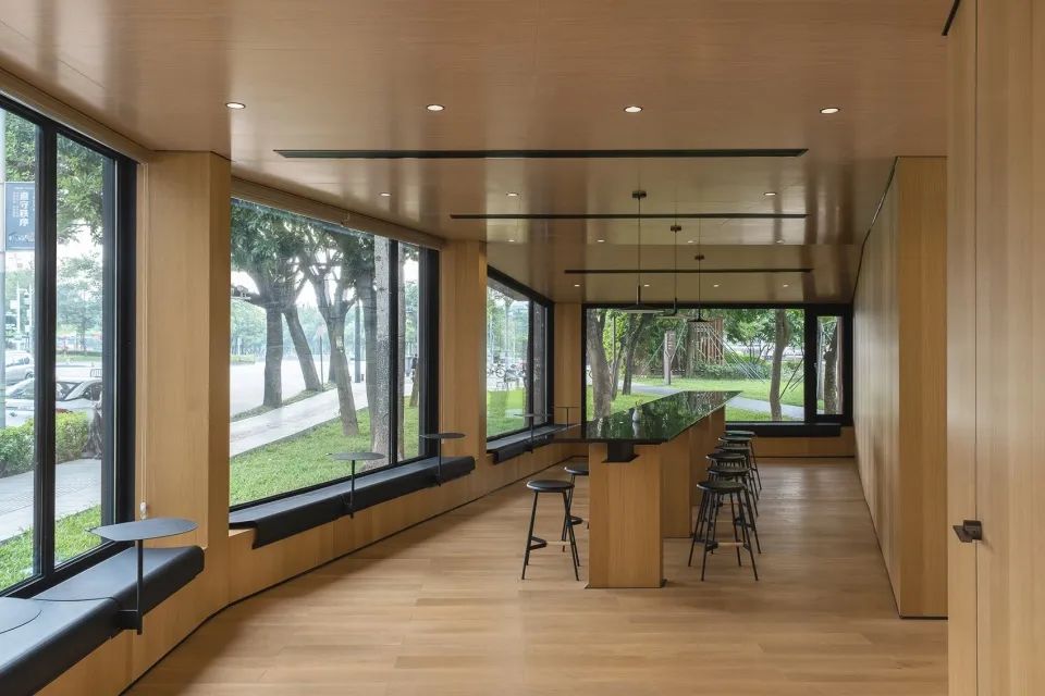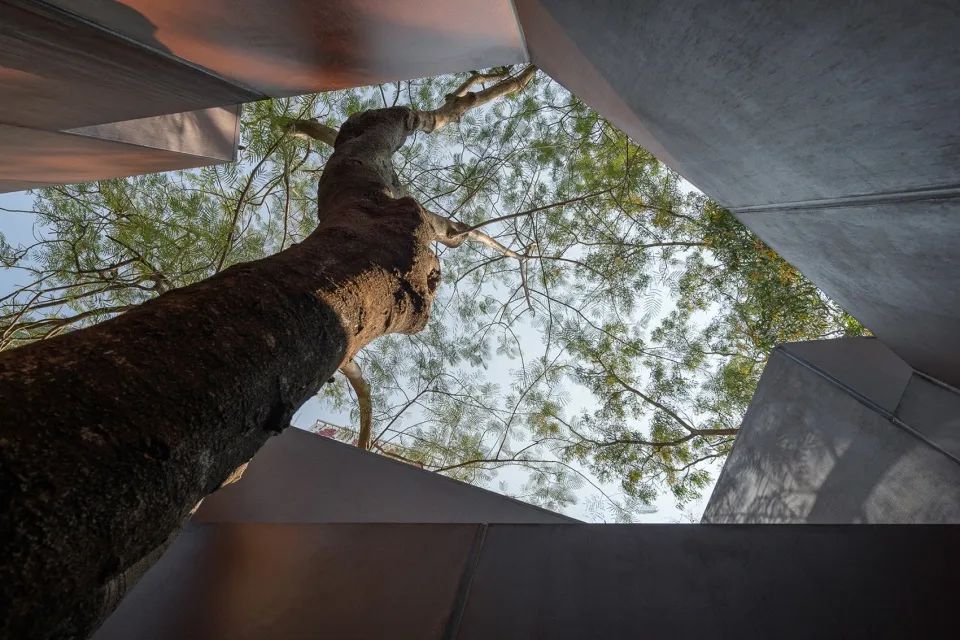 不同于传统的双坡屋顶,建筑被树木分开的两个体量分别向北和向西放坡,在回应场地气候特征的同时也减小了对现状树冠的影响。这让建筑在面对不同的城市界面时展现出不同的姿态:北侧屋檐向河面低垂,风景经由结构柱所界定的窗洞涌入室内;西侧屋面向路口广场俯身,以漂浮的姿态掩映于树木之后,让建筑纳入风景的同时也成为风景。