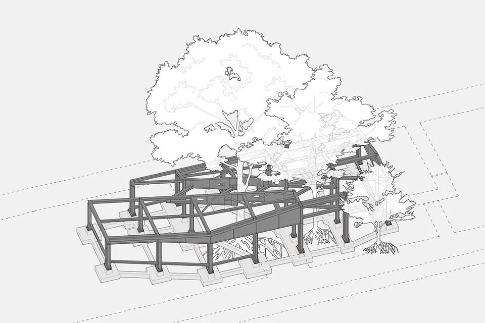 作为一个建造于既有绿地上的新增建筑,我们需要尽量减小施工过程对周边环境的影响,同时也需要应对工期压力,钢结构体系轻盈且可预制,自然而然成为最佳选择。我们选择200mm的H型钢作为基本的结构构件,其翼缘直接暴露在外形成建筑立面。在建筑面向风景的南北两侧,双柱形成的短墙强化了建筑在景观方向的空间深度,形成框景效果。同时,双柱也在构造层面解决了某些节点不同角度H型钢梁柱的交接问题。为了进一步减小建筑对于树木根系的影响,我们在树干周边设置了跨度更大的异形梁,树干周边的部分混凝土独立基础也变成筏板基础,为树根保留呼吸的空间。对于局部树冠低垂处,建筑的体量也做了退让处理。