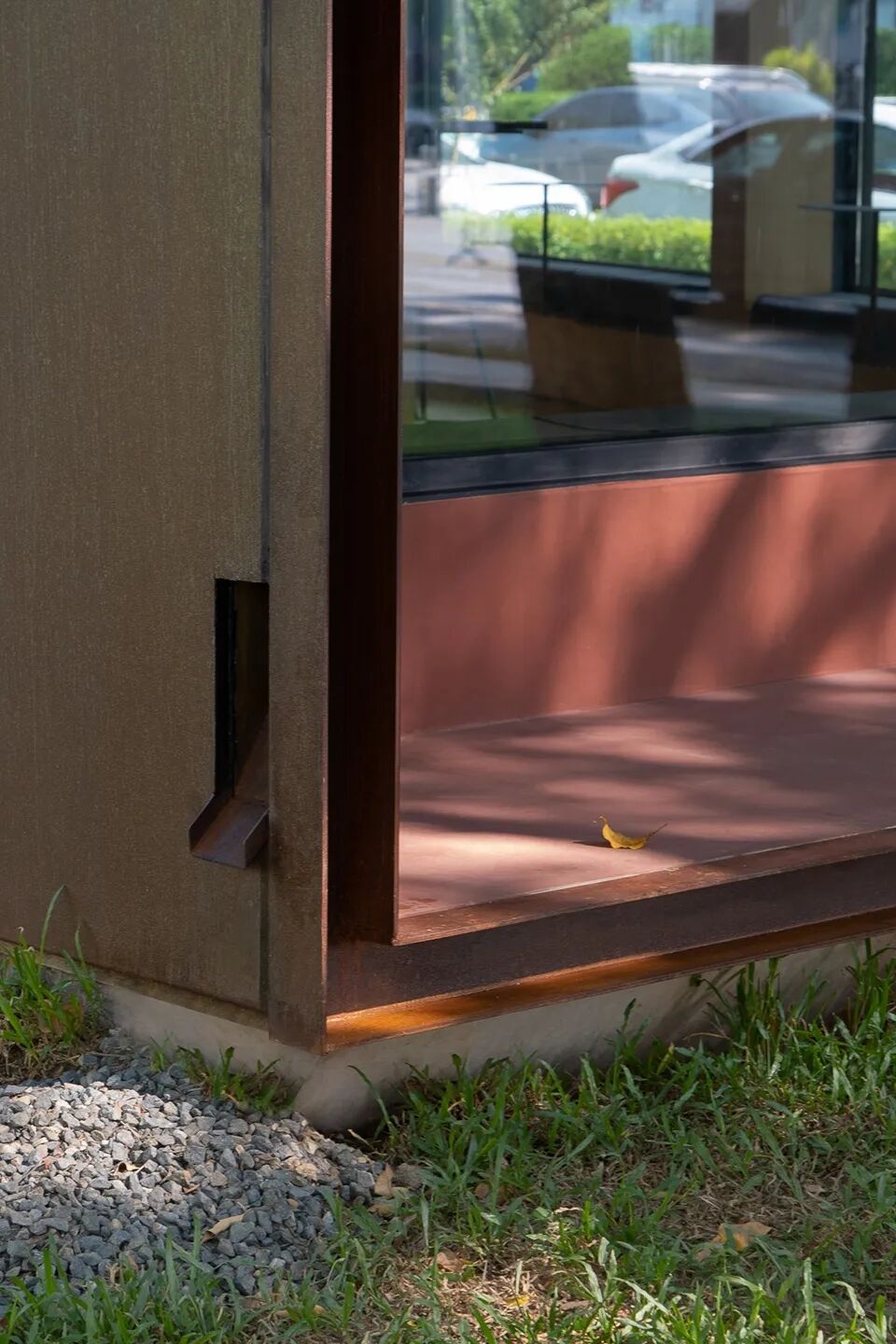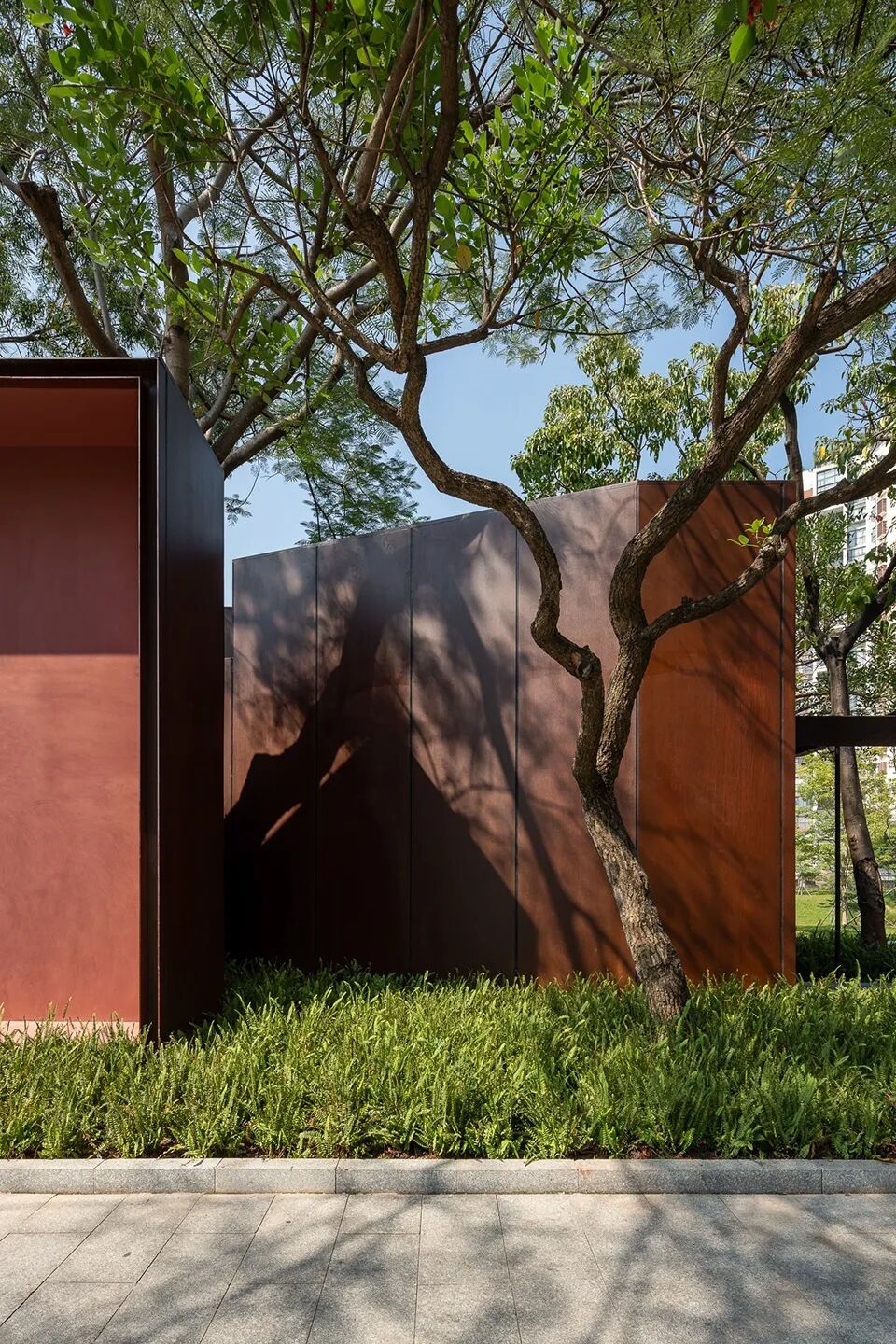建筑主体由红色锈蚀耐候钢包裹而成,在建筑的边缘,我们设计了特别的耐候钢预制件,既作为建筑的收边消减体量,也作为暗沟与将雨水管藏入其中,形成有组织排水。