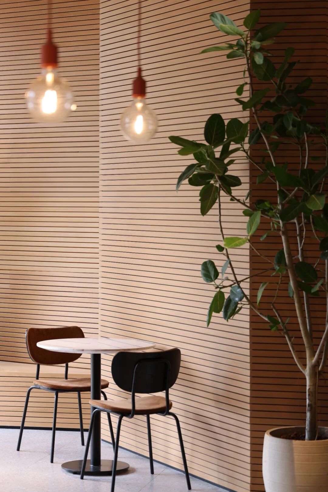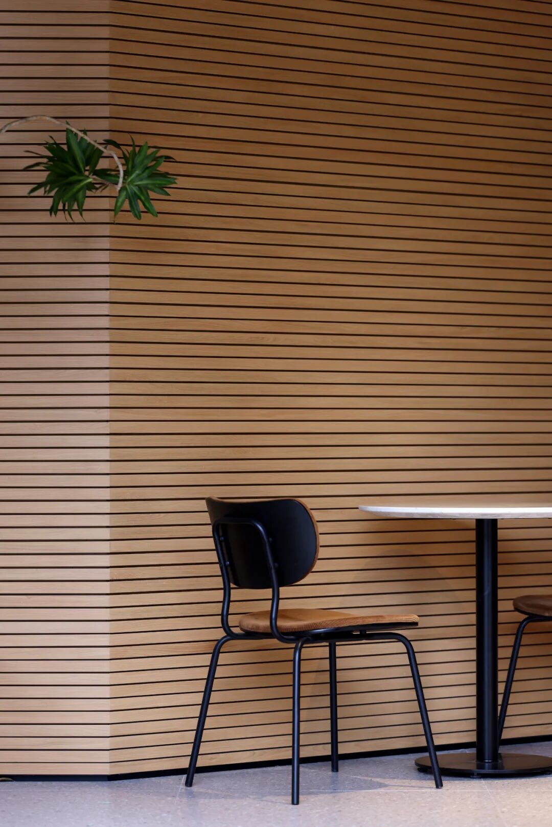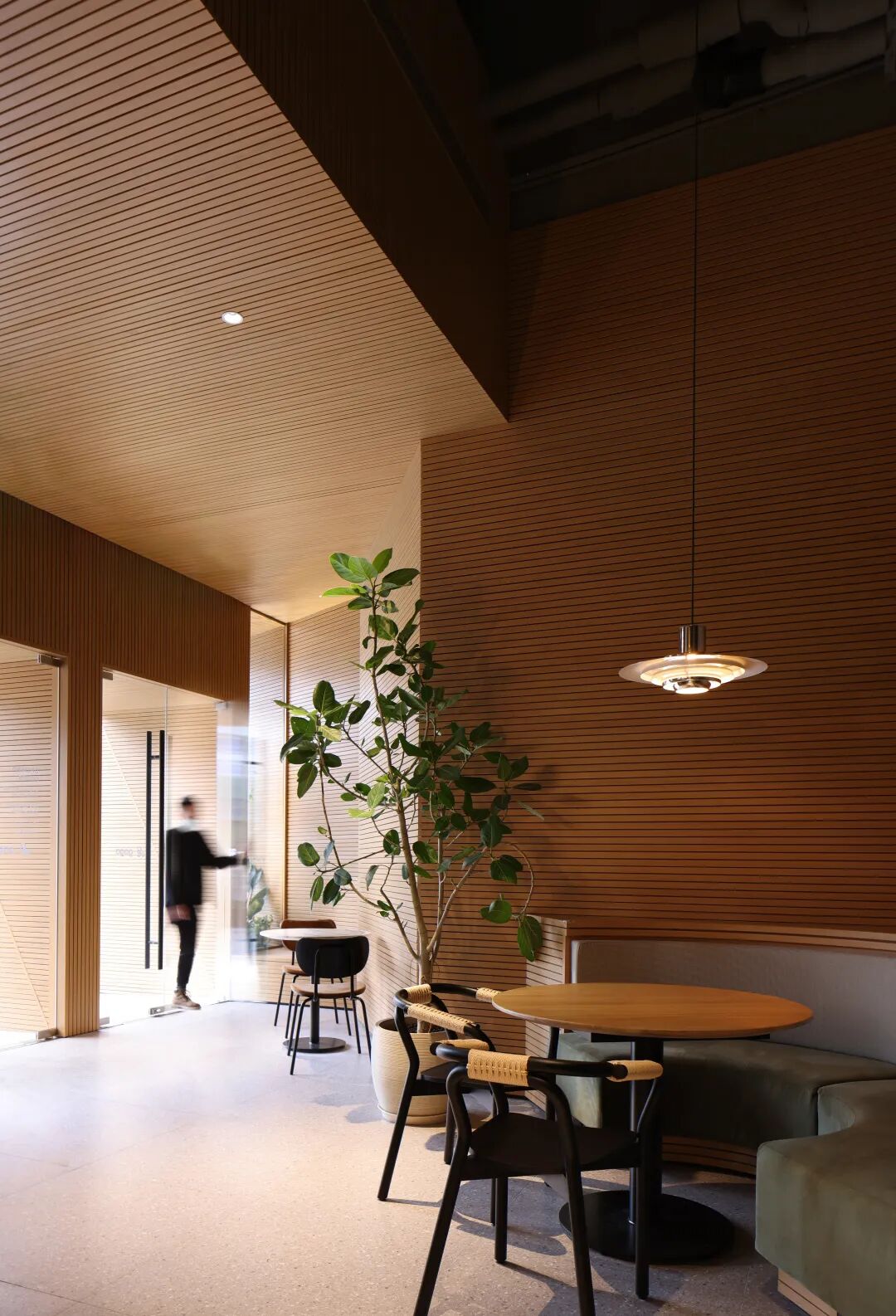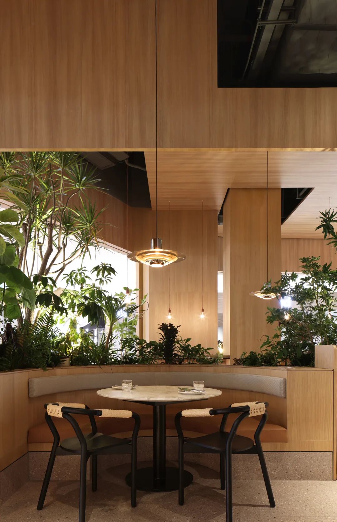 空间材质以温和的木质搭配绿植为主,让人与物的关系从城市的工业属性转化为自然属性,为就餐空间创造一个具有场景性的绿洲环境。空间气质上尽可能避免给人一种“效率化”感受,颜色、材料选择尽可能地体现“亲生物性”,而空间中留有原建筑的迹象,让二者之间并没有形成强烈的分隔感,使其相互保持着一种对立与统一。