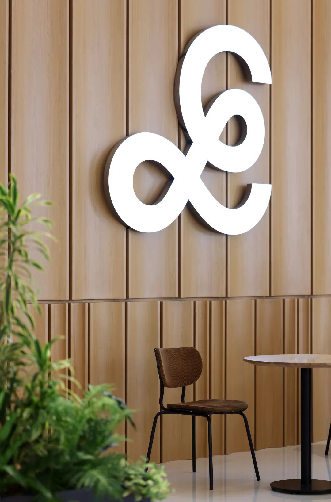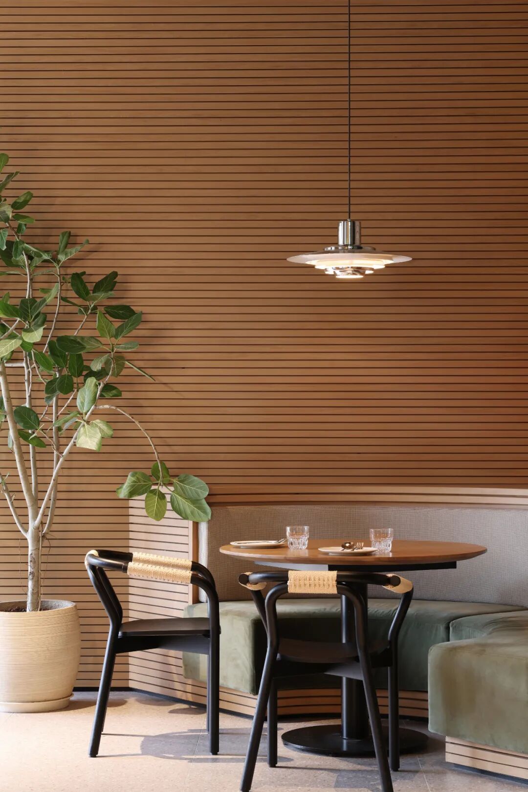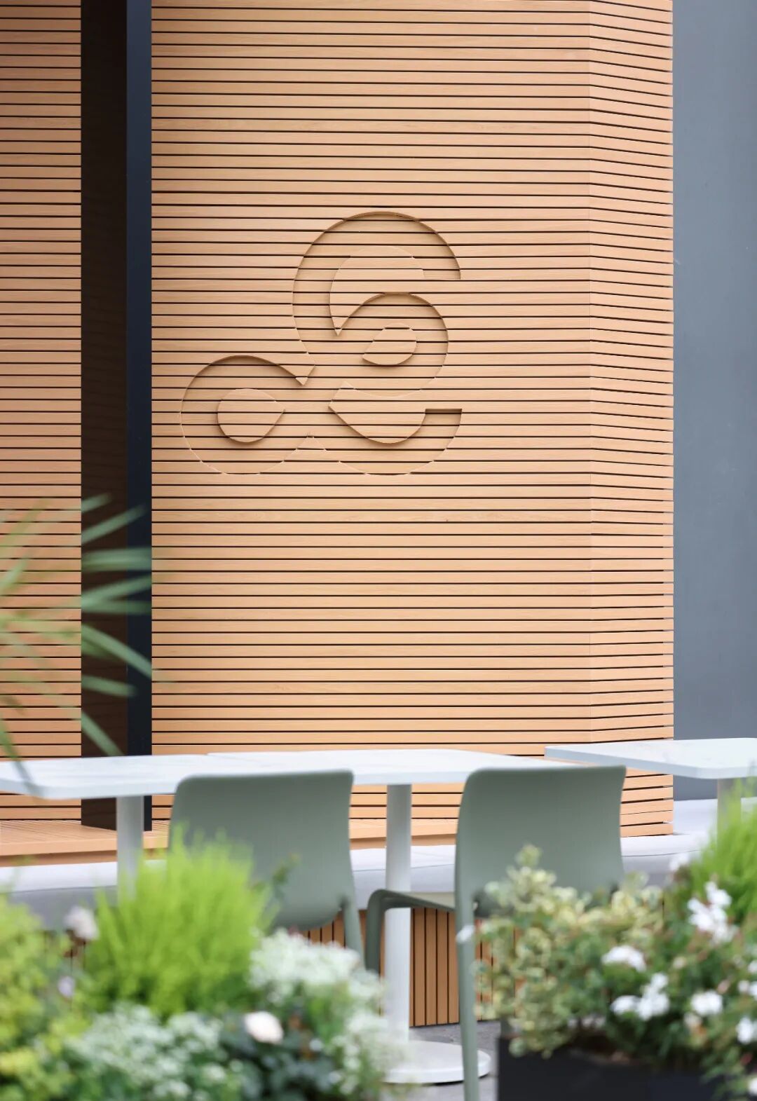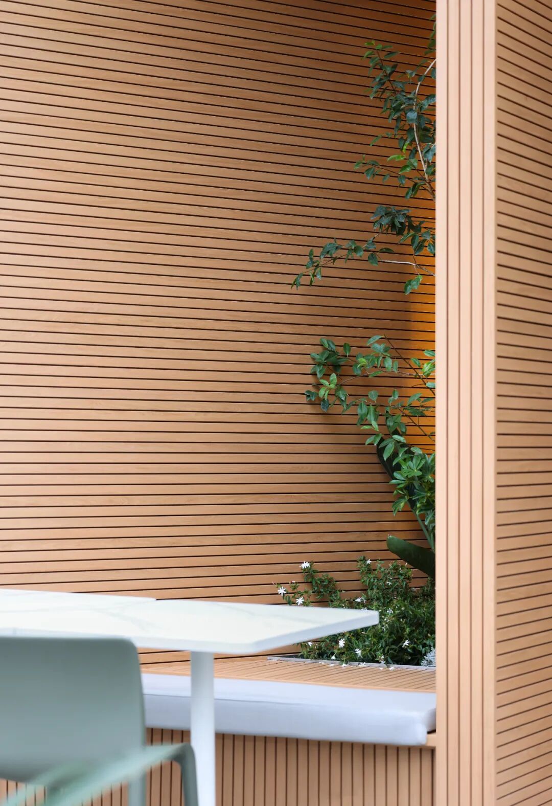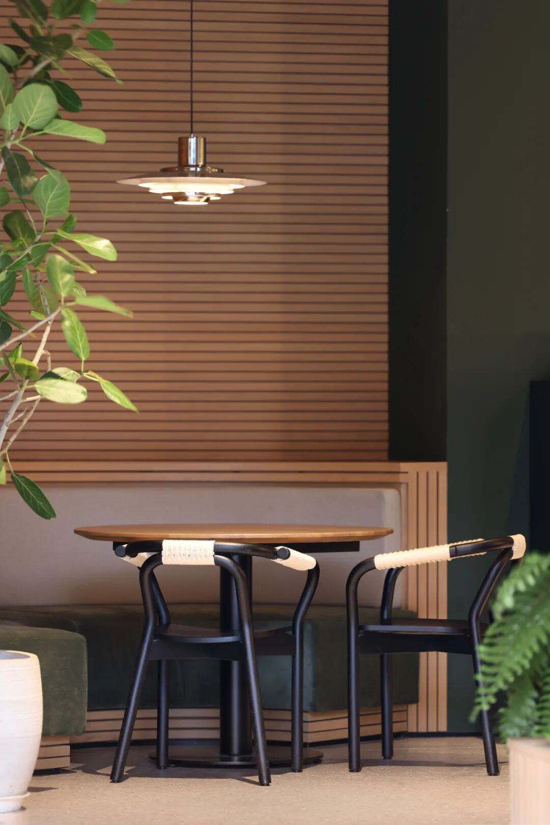 空间材质以温和的木质搭配绿植为主,让人与物的关系从城市的工业属性转化为自然属性,为就餐空间创造一个具有场景性的绿洲环境。空间气质上尽可能避免给人一种“效率化”感受,颜色、材料选择尽可能地体现“亲生物性”,而空间中留有原建筑的迹象,让二者之间并没有形成强烈的分隔感,使其相互保持着一种对立与统一。
