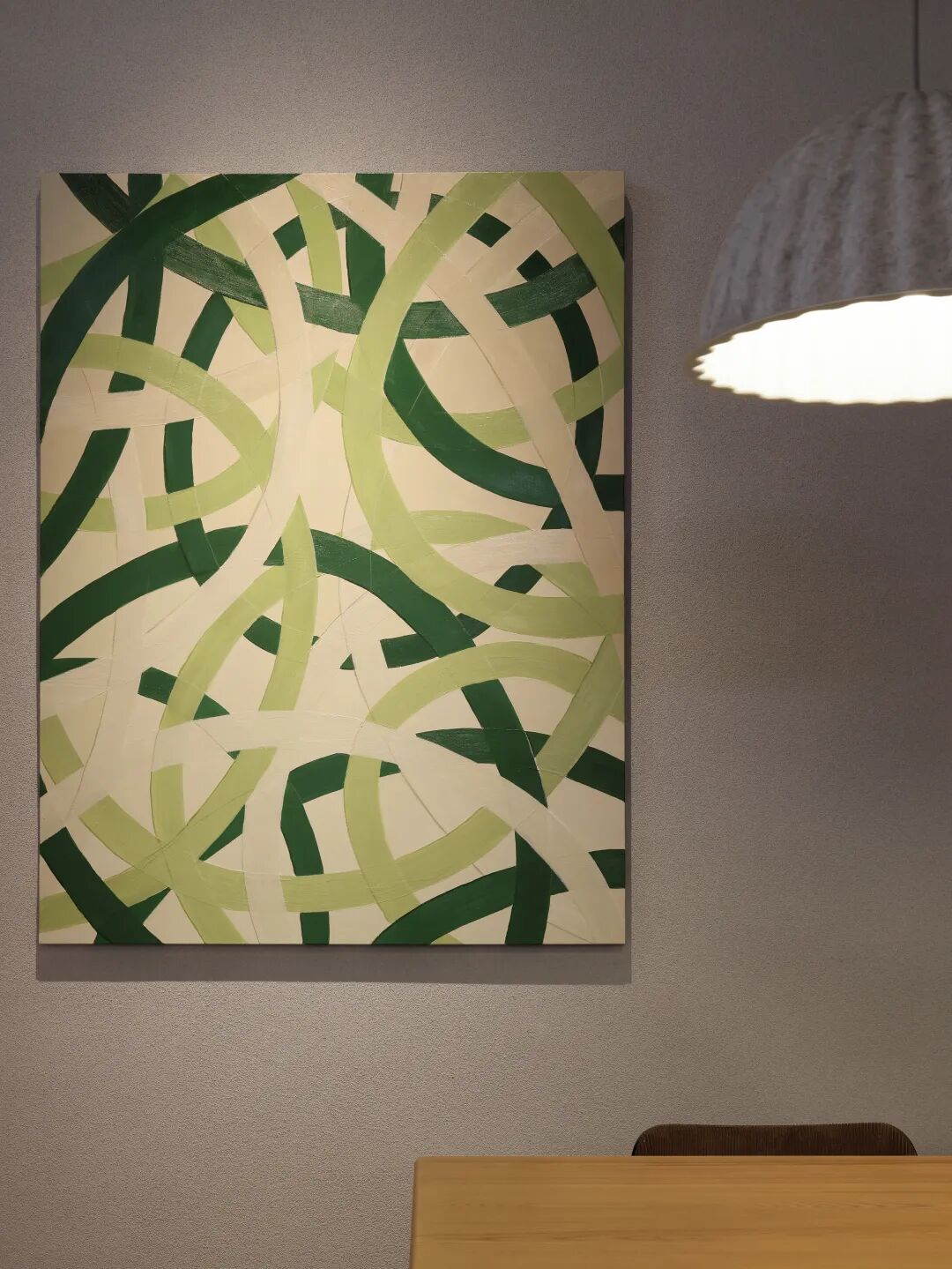 天花上若干木质板片横竖交错,板片上随机开出大小不一的洞口,板片的“简洁性”好比一张画布基础,透过板片的洞口和板片之间的缝隙将原本应该隐藏在内的天花管道体系的“复杂性”给强化出来。