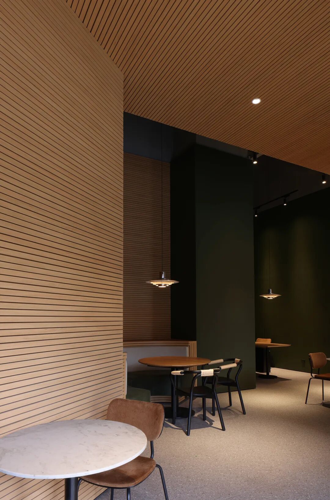 内置的餐位也呈现出多样性,满足了不同群体在不同的时间段的进餐需求。柔和的光照恰好打亮就餐区域,结合温润的木色与品牌特有的暗绿色为空间基调,给予顾客一个松弛且自然的用餐氛围。光影的捕捉是对时间流逝最好的记录,光的生命强而有力,在材质上及形体上,缓慢地留下痕迹,映射出时间与空间的流转,二者之间融合而又统一。