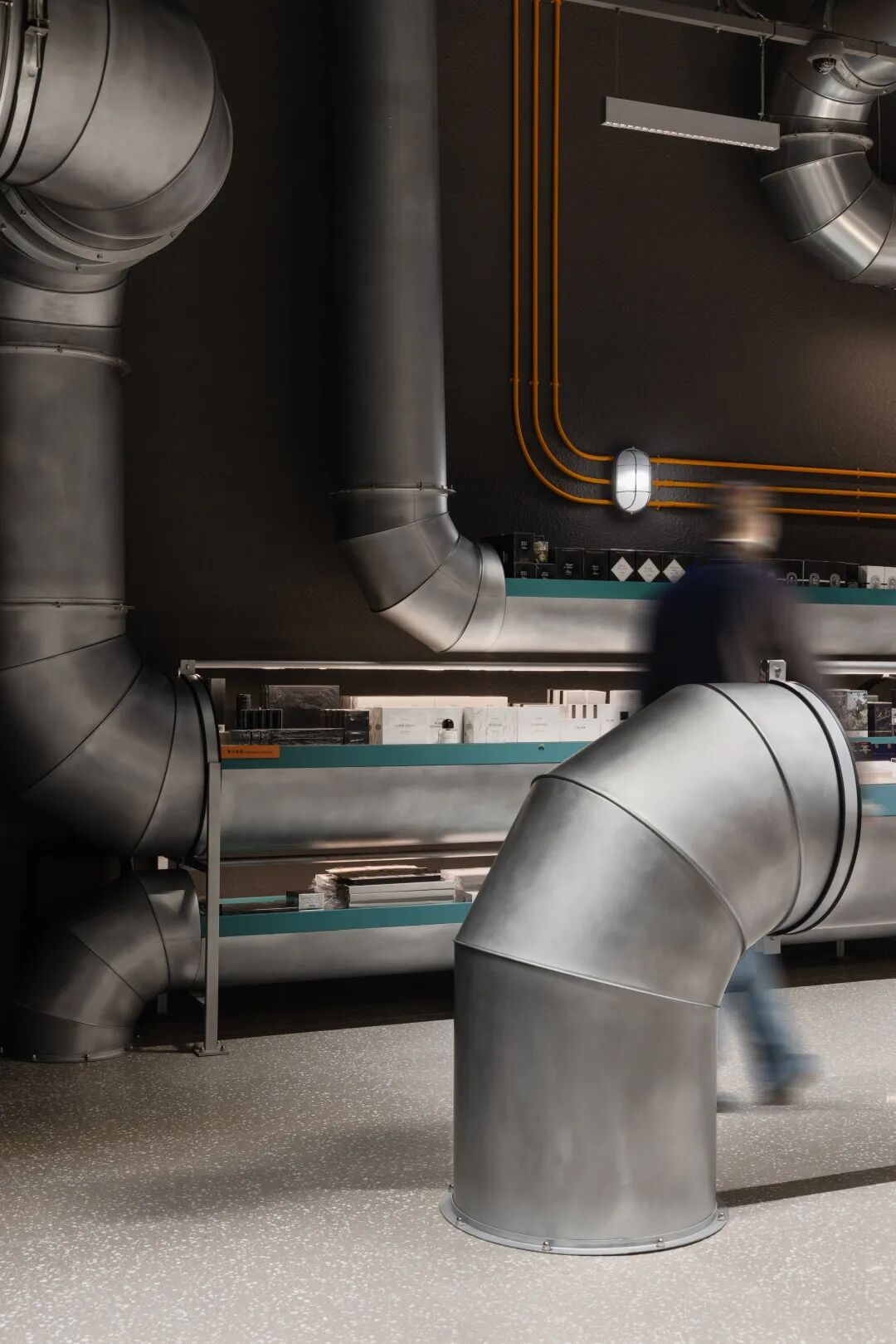 空间内部的旅程分为三个自然阶段。首先,管道系统包裹着空间,并被潜移默化为功能性的家具,它们不再是独立的物体,而是一个与整个空间关联的系统。管道家具与品牌标志性的绿色结合,这一细节的设计灵感最初来自工厂中普遍应用的货架。
