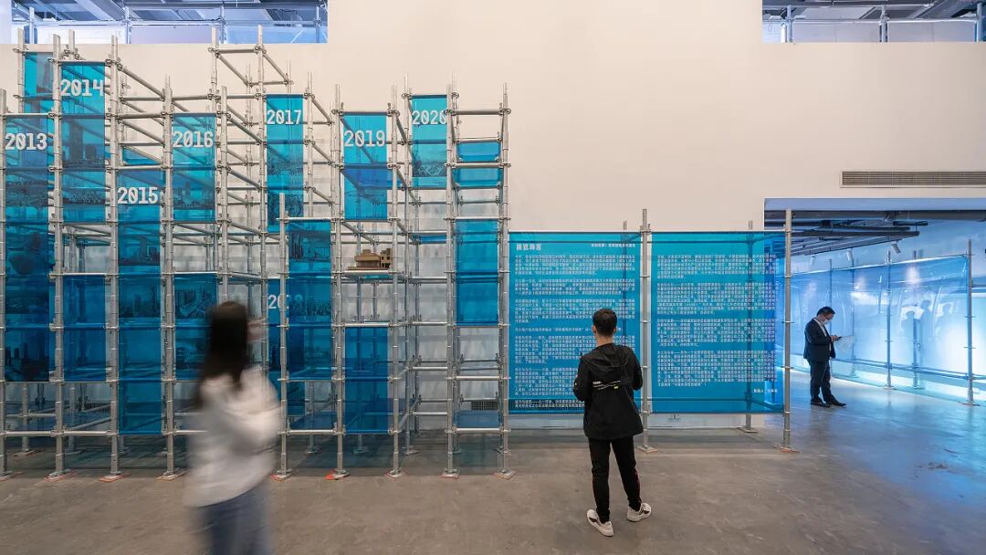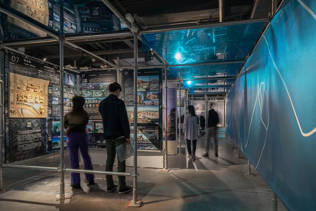 而展览现场的布置,则借用脚手架这一工地常见元素来构建,镶嵌的蓝色亚克力让人犹如步入一座海滨城市的建筑现场。