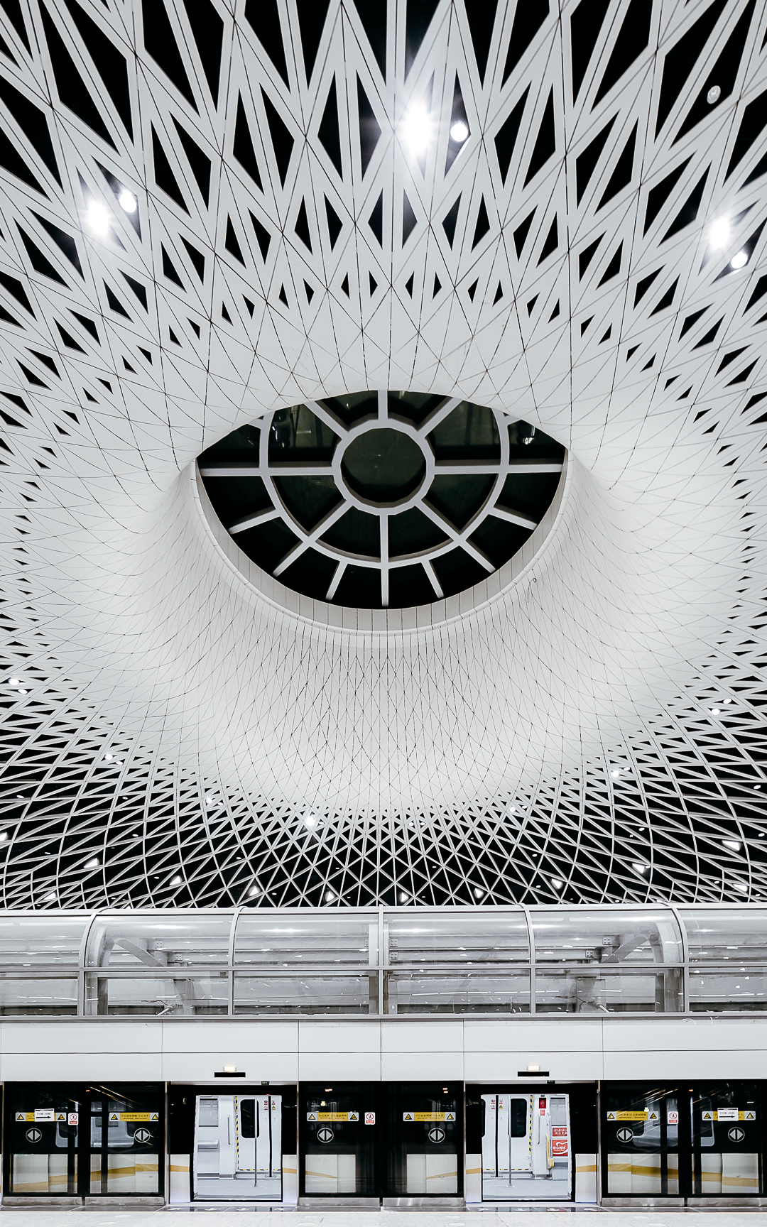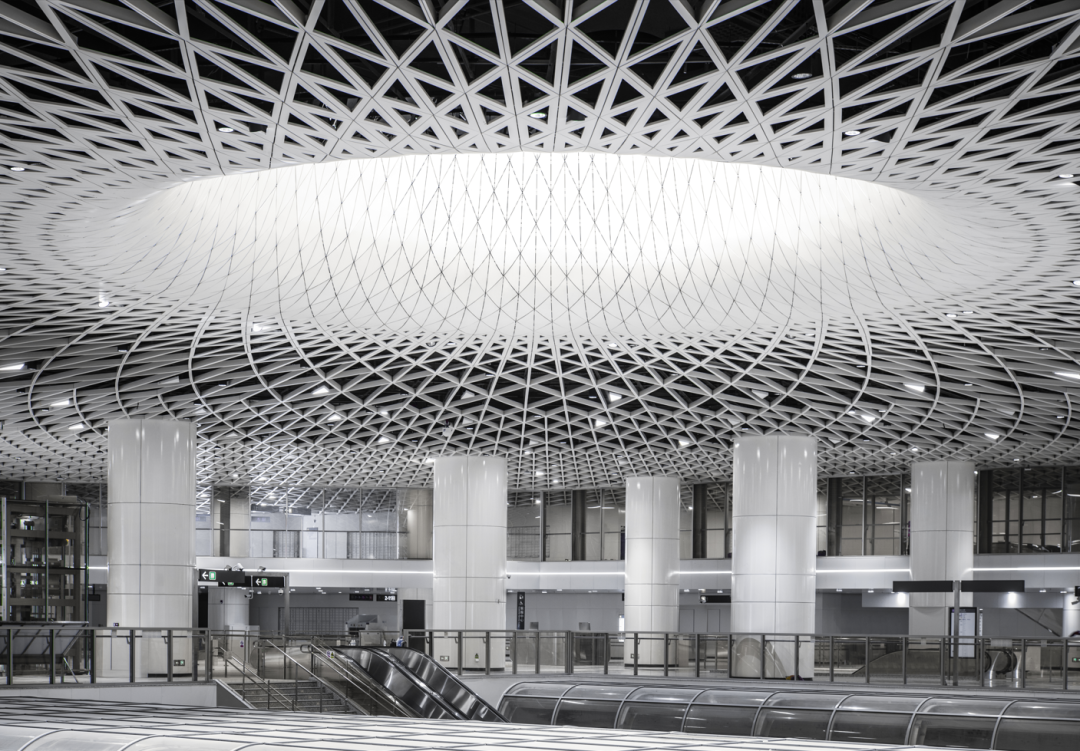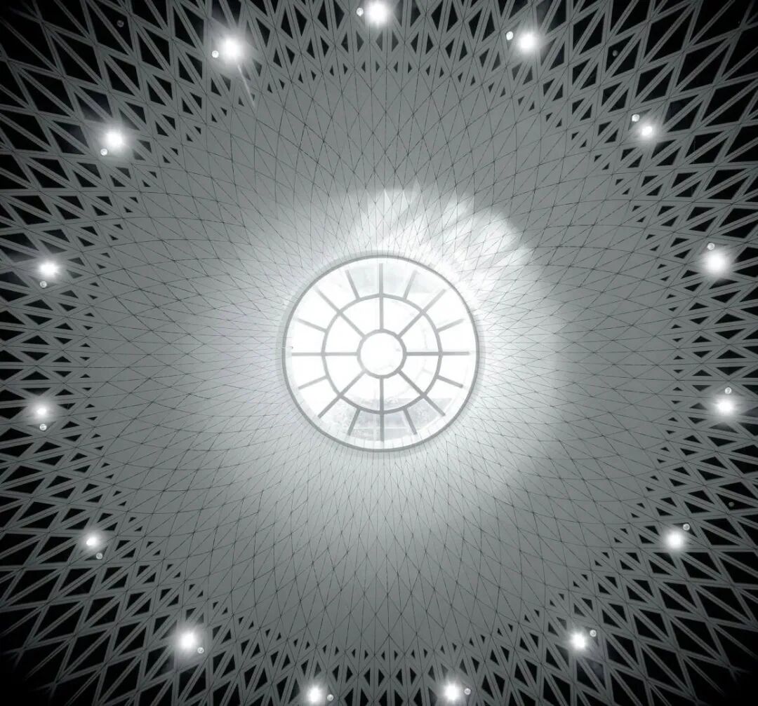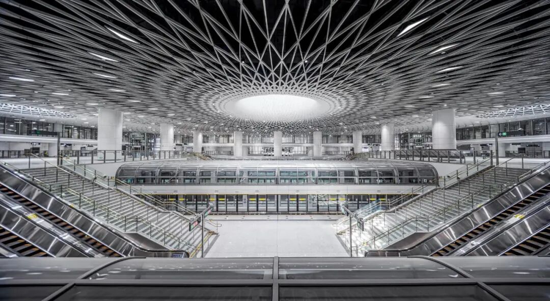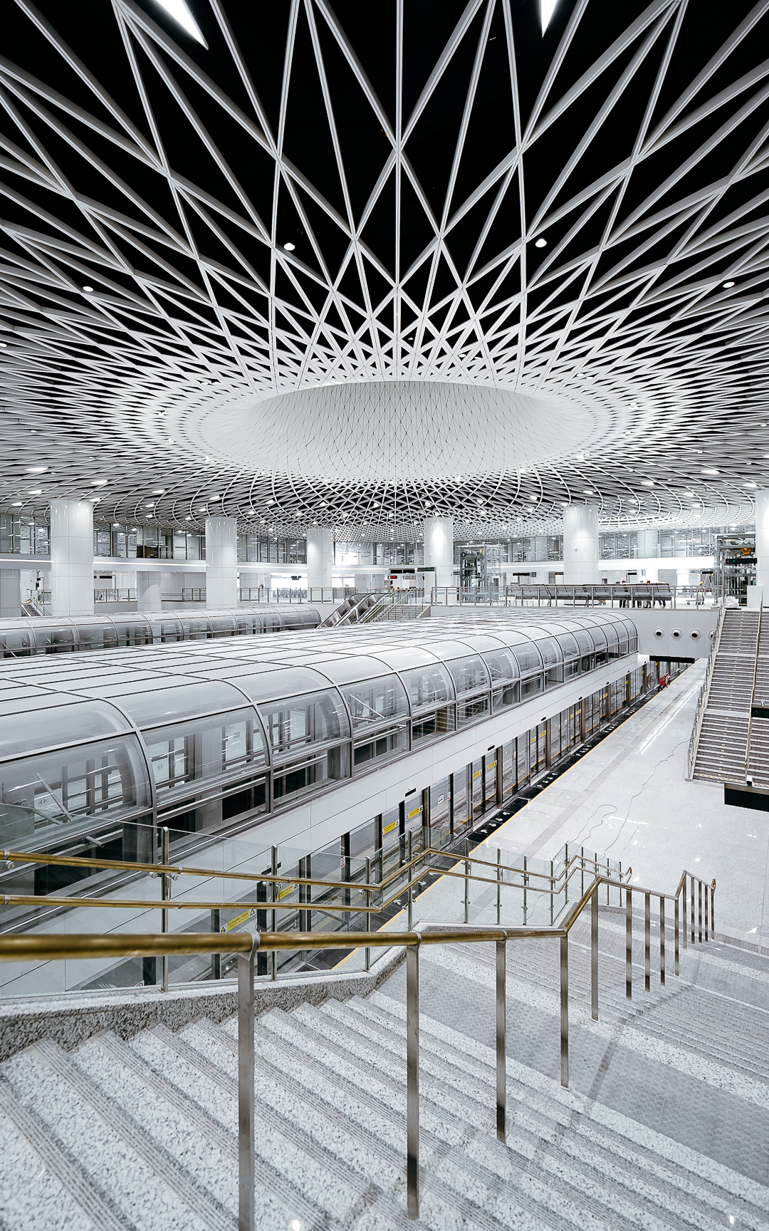 走入岗厦北枢纽站厅层,目光受天空感召向上,纵横交错的天花造型给人强烈的视觉震撼,无数线条共同指向、有序靠拢收缩,最终抵达一扇直径9米的巨大圆形天窗。它犹如中心透视里视觉的灭点,引领观众经由透视空间步入深邃诗意的精神世界。