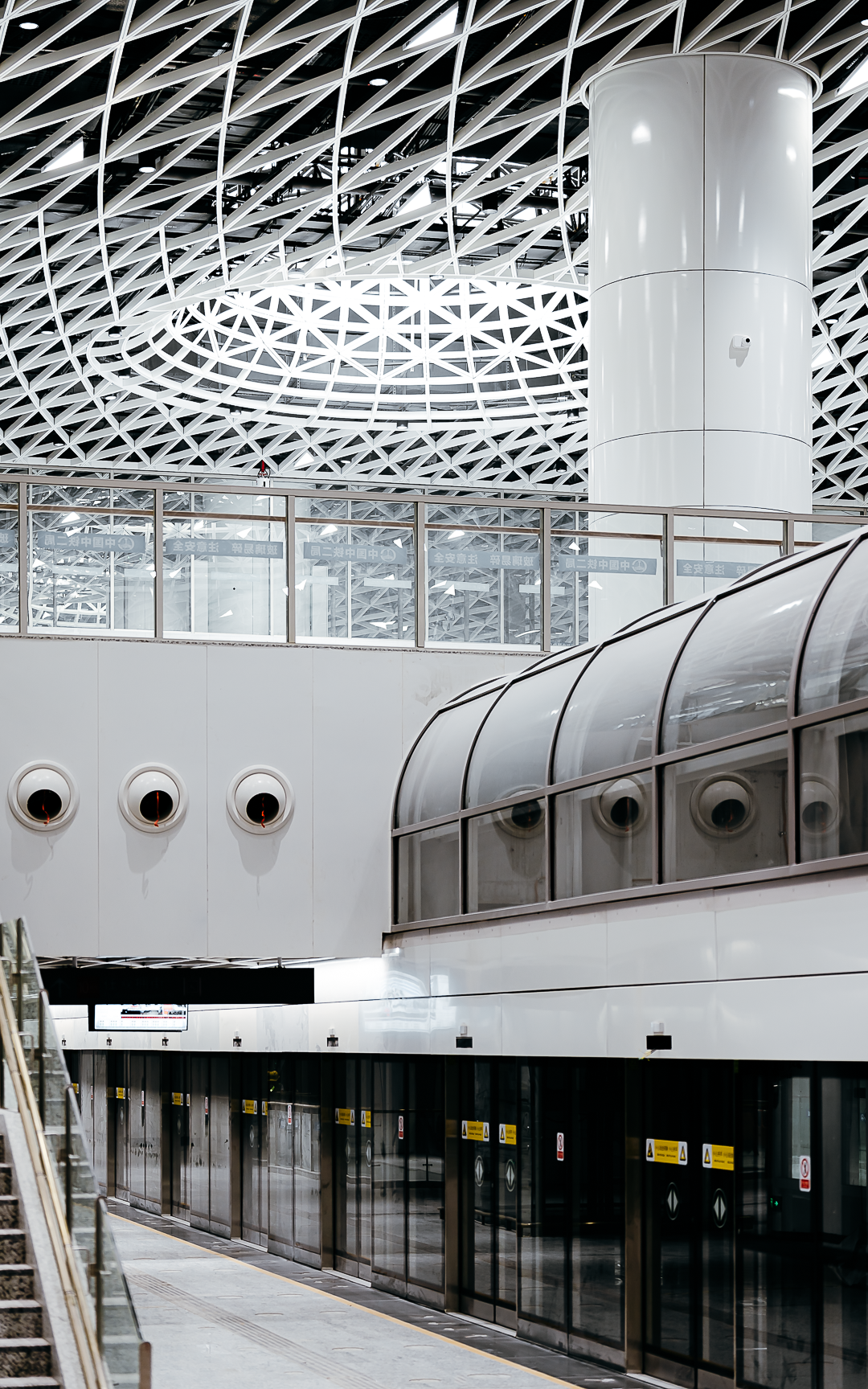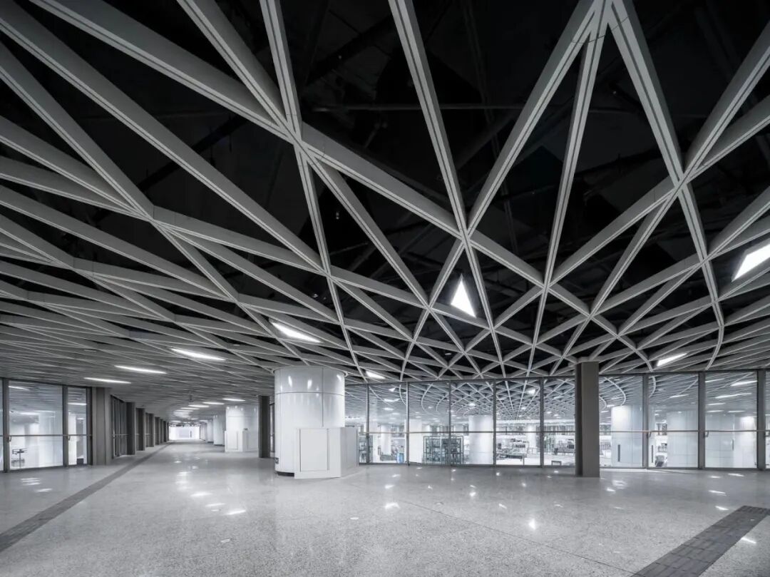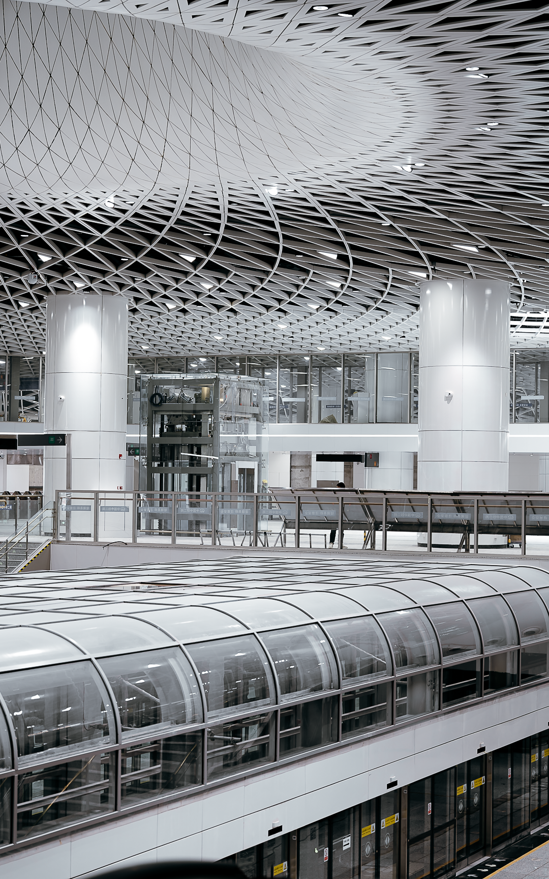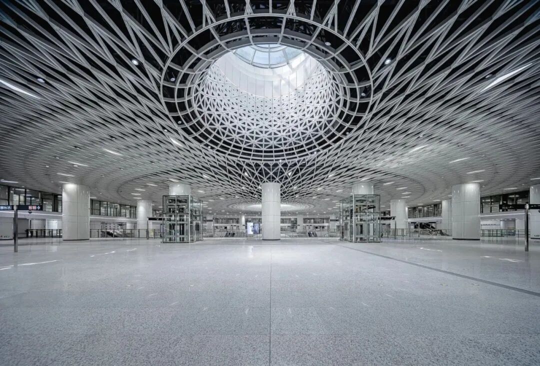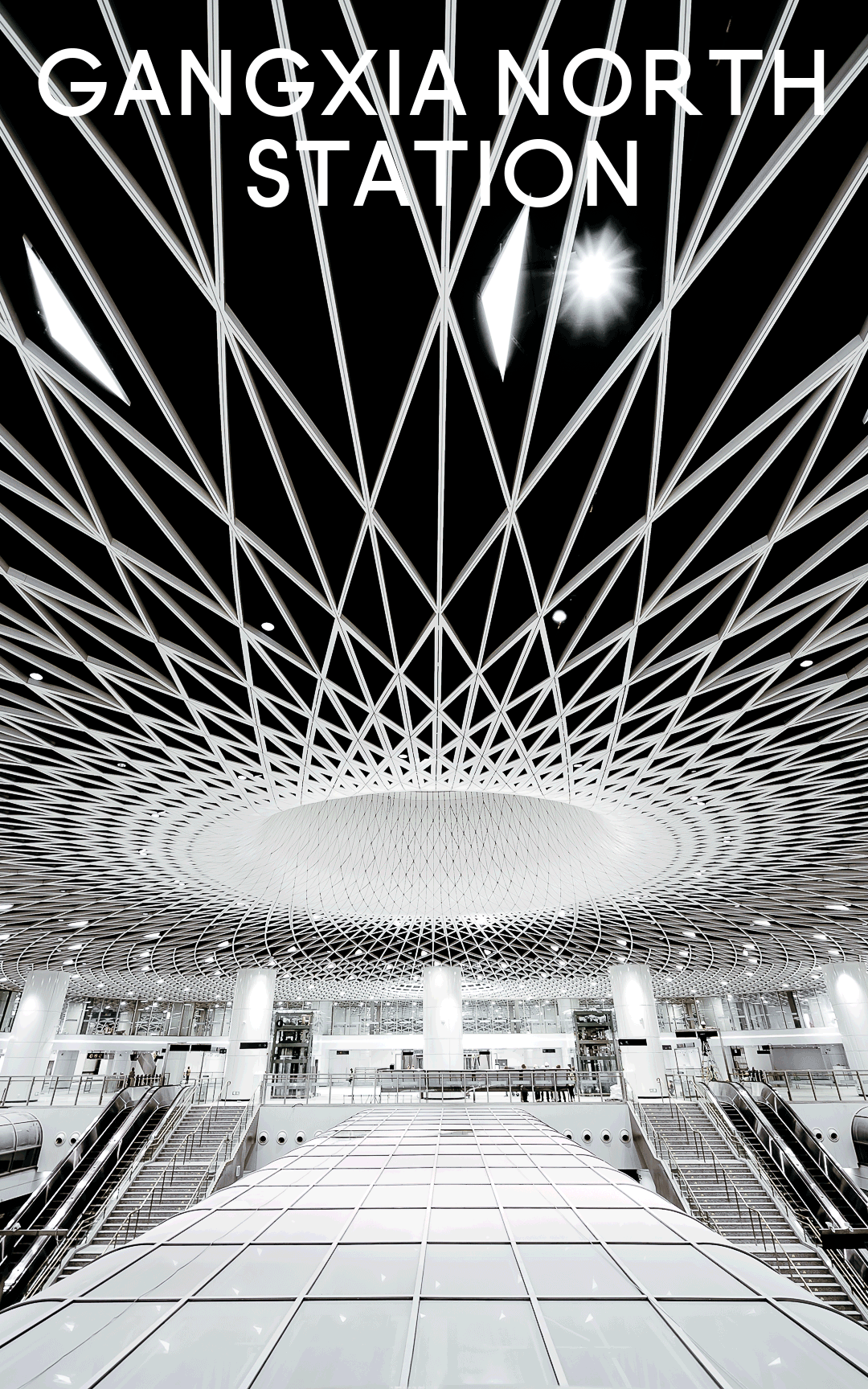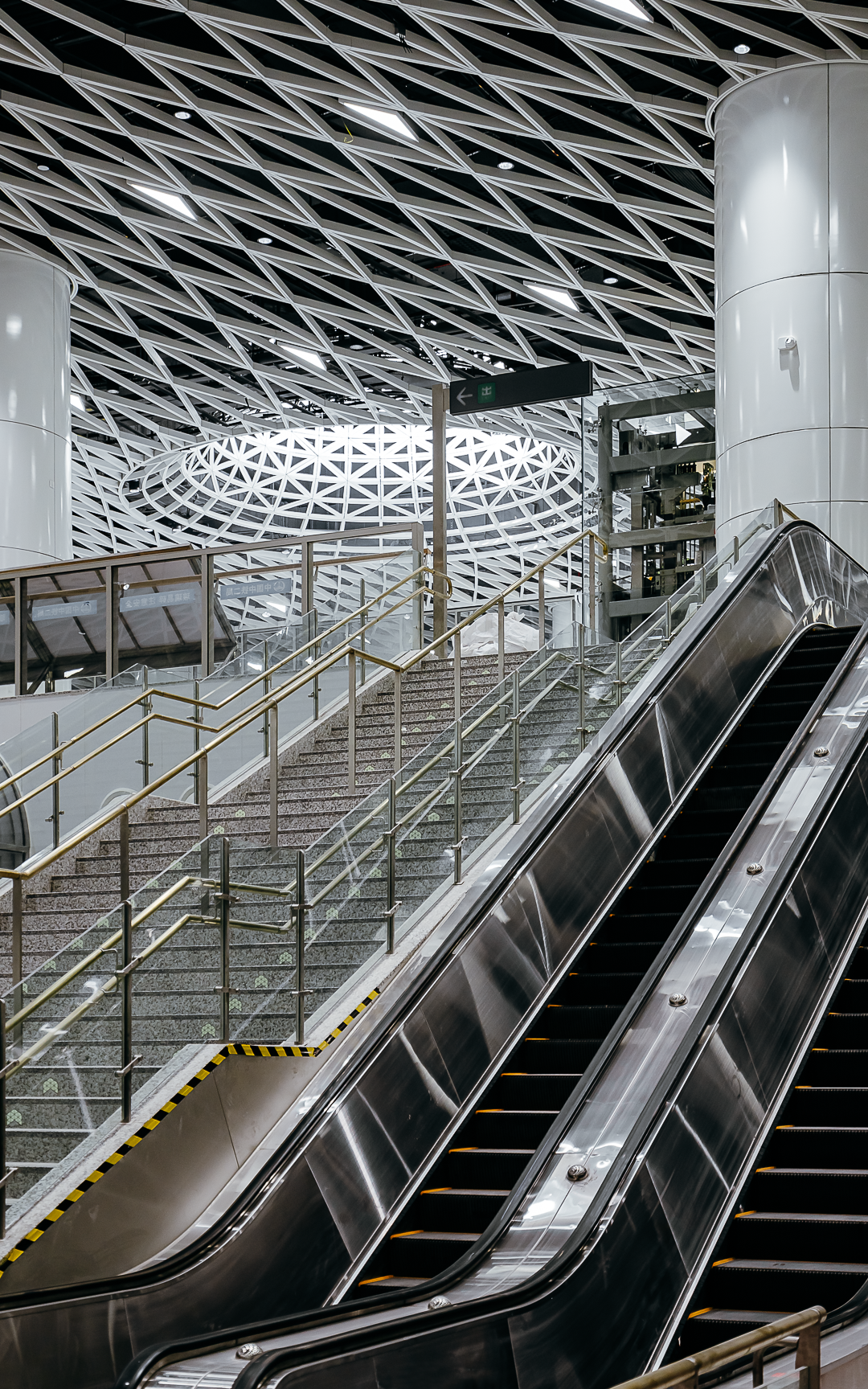 走入岗厦北枢纽站厅层,目光受天空感召向上,纵横交错的天花造型给人强烈的视觉震撼,无数线条共同指向、有序靠拢收缩,最终抵达一扇直径9米的巨大圆形天窗。它犹如中心透视里视觉的灭点,引领观众经由透视空间步入深邃诗意的精神世界。