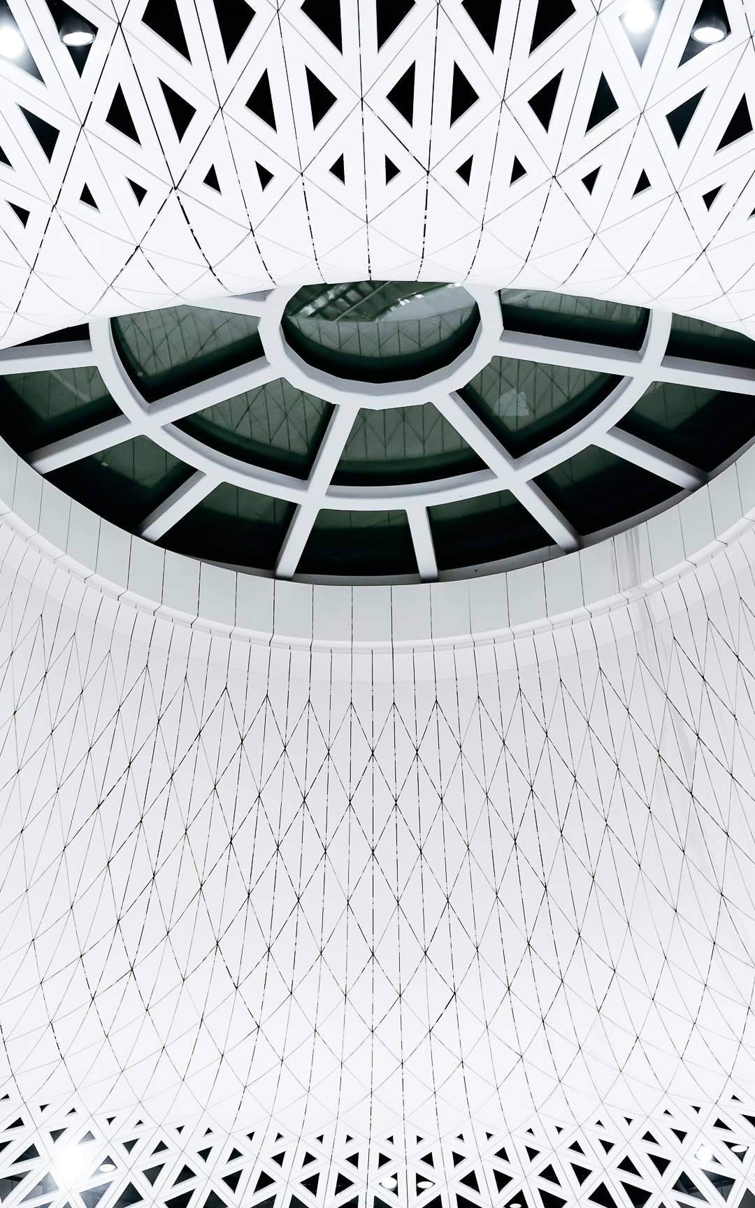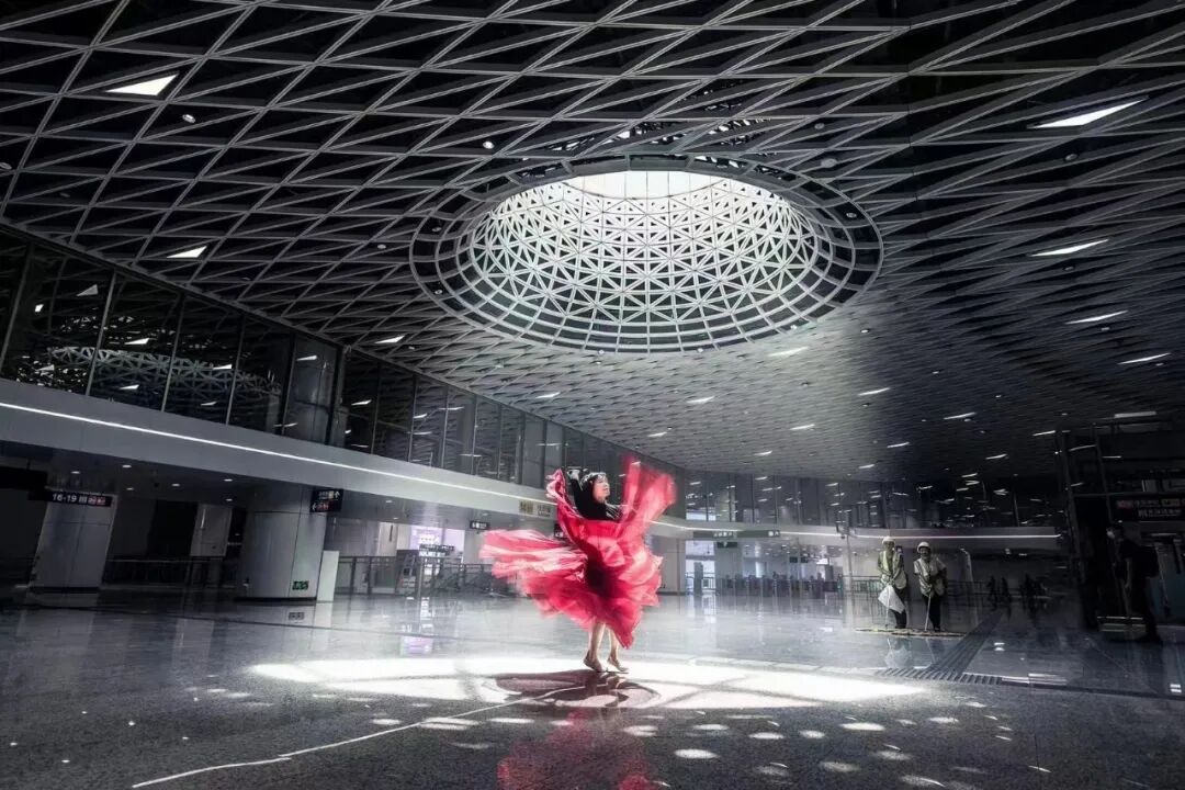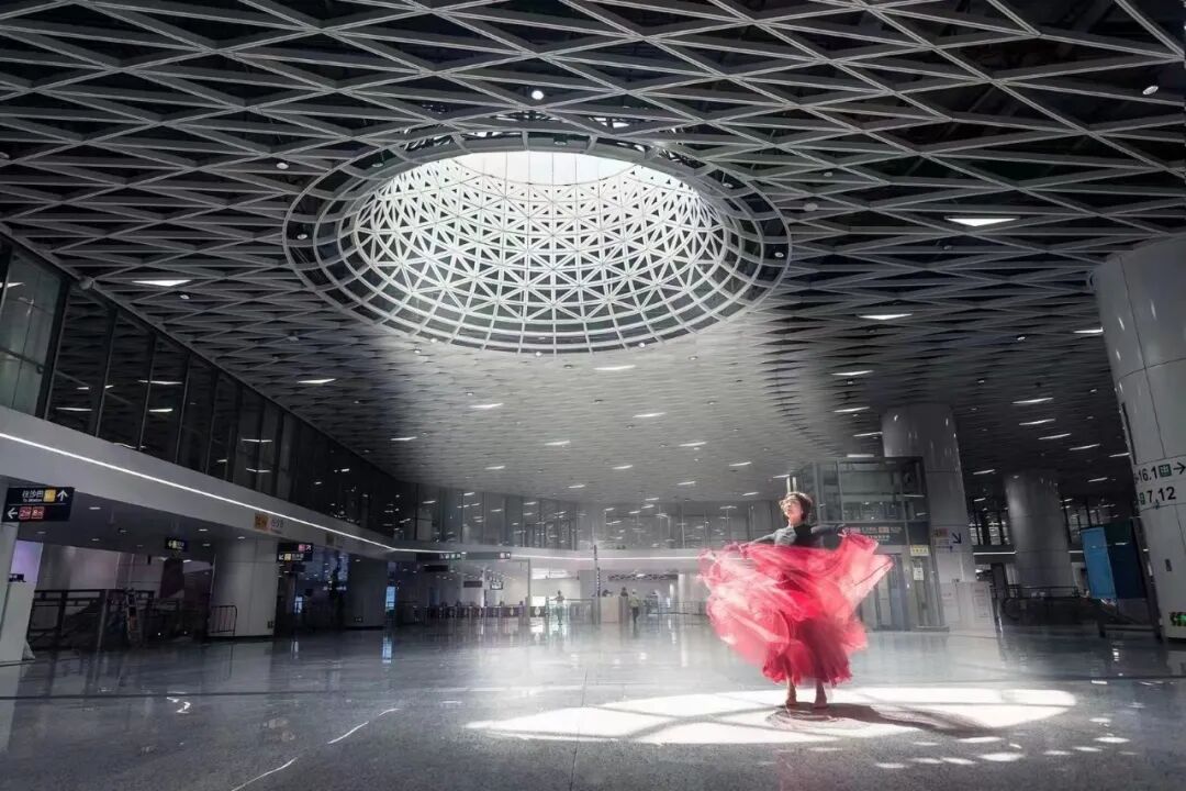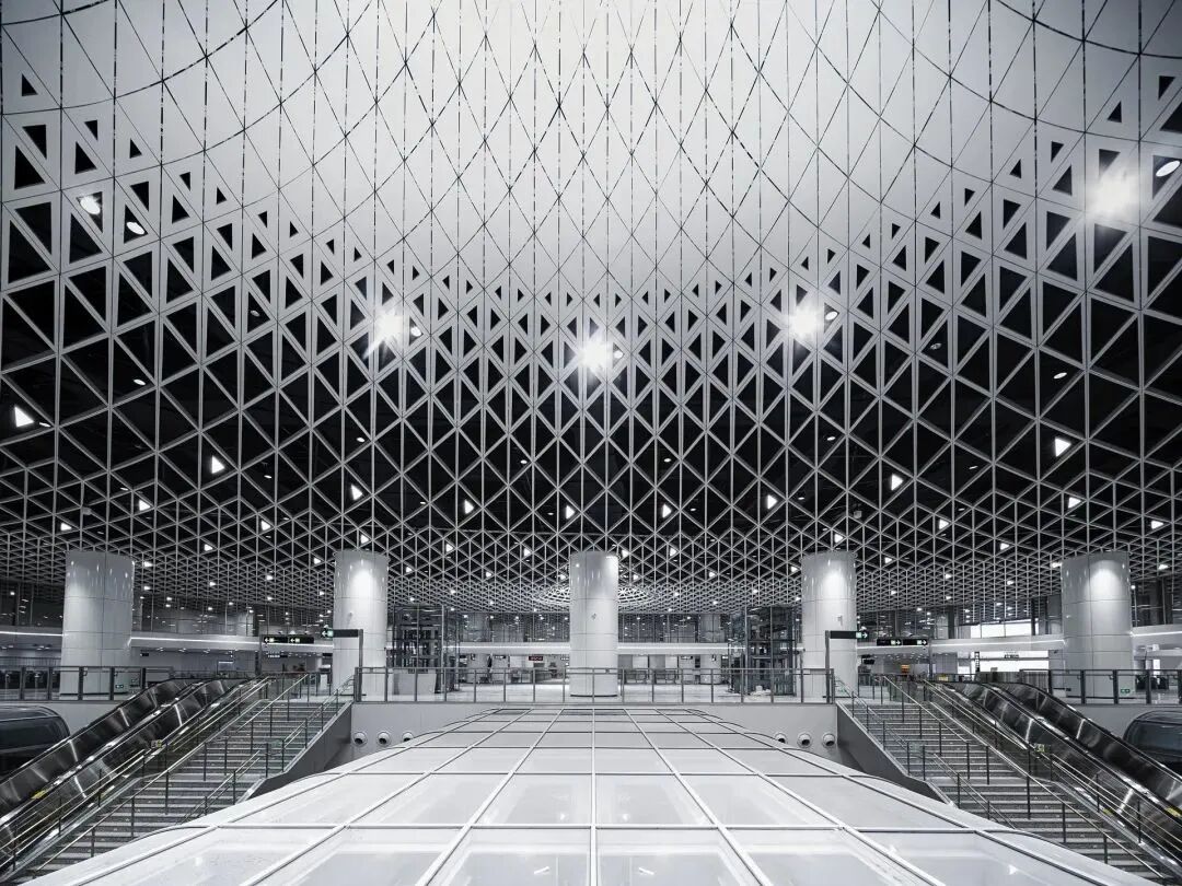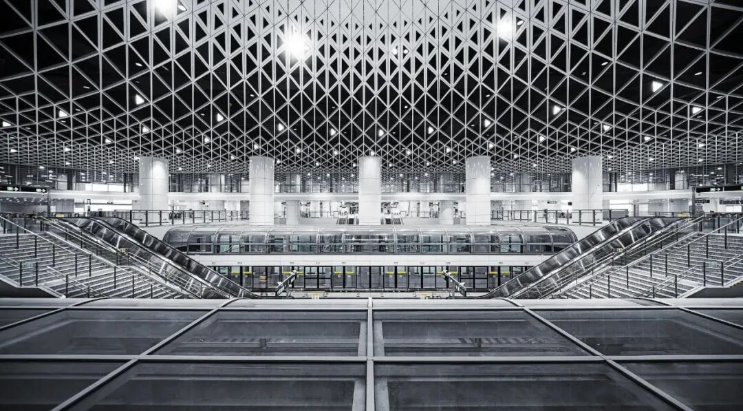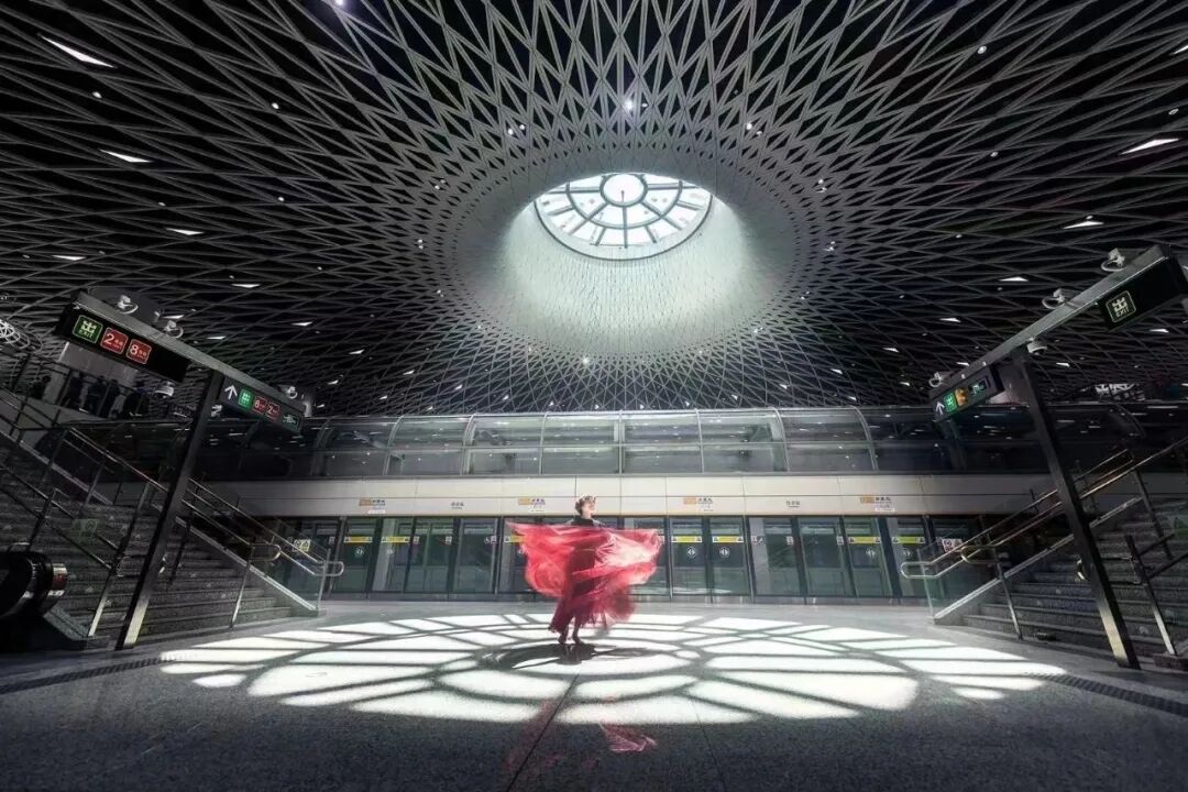 走入岗厦北枢纽站厅层,目光受天空感召向上,纵横交错的天花造型给人强烈的视觉震撼,无数线条共同指向、有序靠拢收缩,最终抵达一扇直径9米的巨大圆形天窗。它犹如中心透视里视觉的灭点,引领观众经由透视空间步入深邃诗意的精神世界。