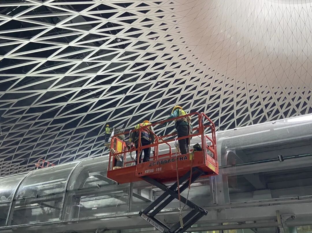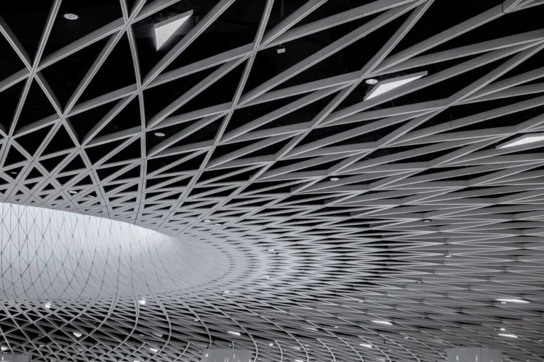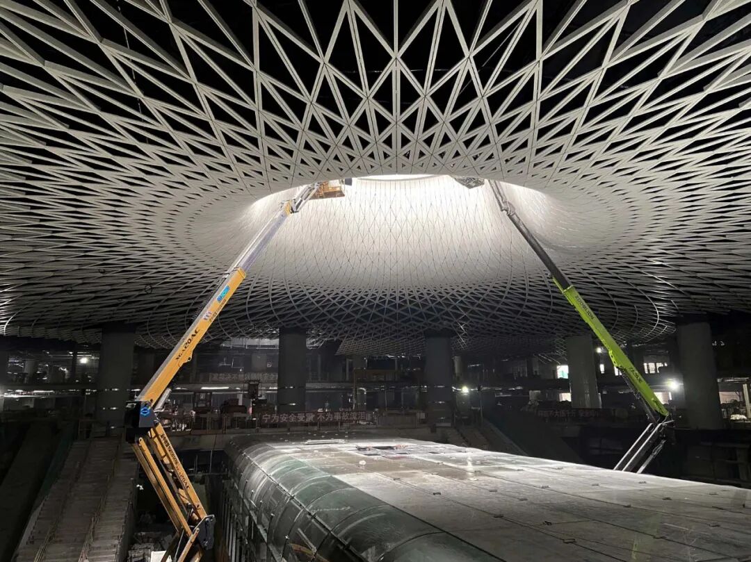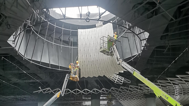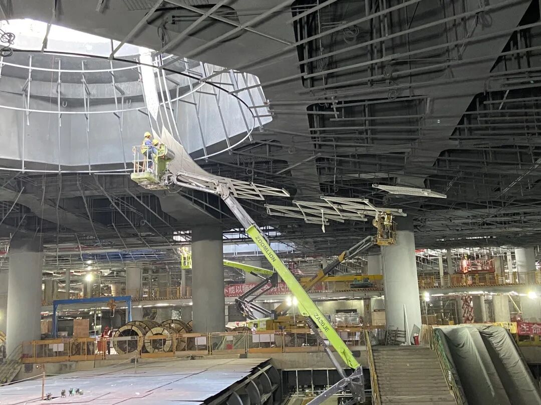 如此复杂曲线要在整幅天花层流畅荡漾开来,施工难度不言而喻。总结下来有三:一是跨度大,“费马螺线”线条实际由无数曲、直方通规律拼接而成,再微小的偏差经过叠加,影响都是巨大的,更何况这是一个48×51.2米超大跨度空间;二是空间高,采光天窗到站台最高19米,吊顶距地15米,高空作业对工人的技术和心理都是考验;三是对圆难,这要求横竖纵轴线,多个方向精准定位,定时定点复核。