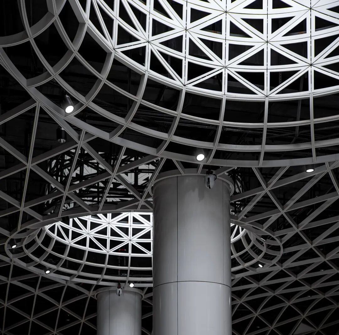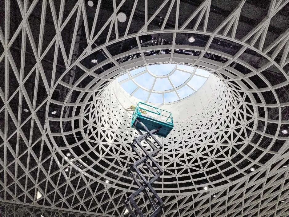 为此施工方在深化阶段,即把转换层与主龙骨合并、优化为一。并与设计方密切沟通,在保证受力富余的情况下,主龙骨做半隐式排列(以天眼为中心向外沿射线布置),尽量隐于表面造型之下,副龙骨则沿线条交汇处有规律设置。为达到最佳隐蔽效果,甚至组织色彩专家“会诊”,最后确认灰色最有利于主龙骨的“消隐”。