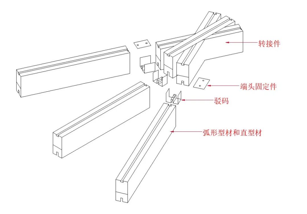 另一个重大优化则针对天花面层——独创米字件连接单元,将原设计切割角度的问题转移到米字件自身加工过程中,成功把整个曲面拼接转化成了直拼,大大降低了现场拼装难度。