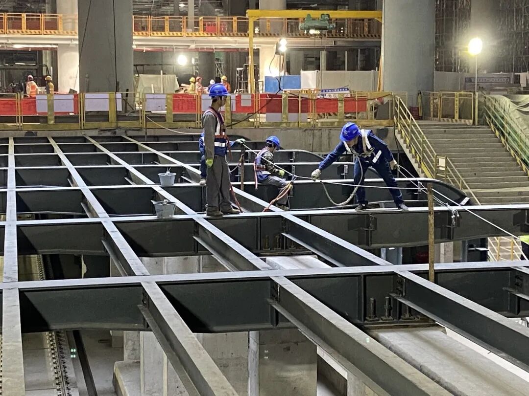 现场基础钢结构涂料亦采用3小时防火涂料,在与玻璃系统龙骨的对接中,智能化建造方法再次发挥作用,精工细造、高效有序作为关键词,被无数双施工人的手,写在了项目的各方各面。