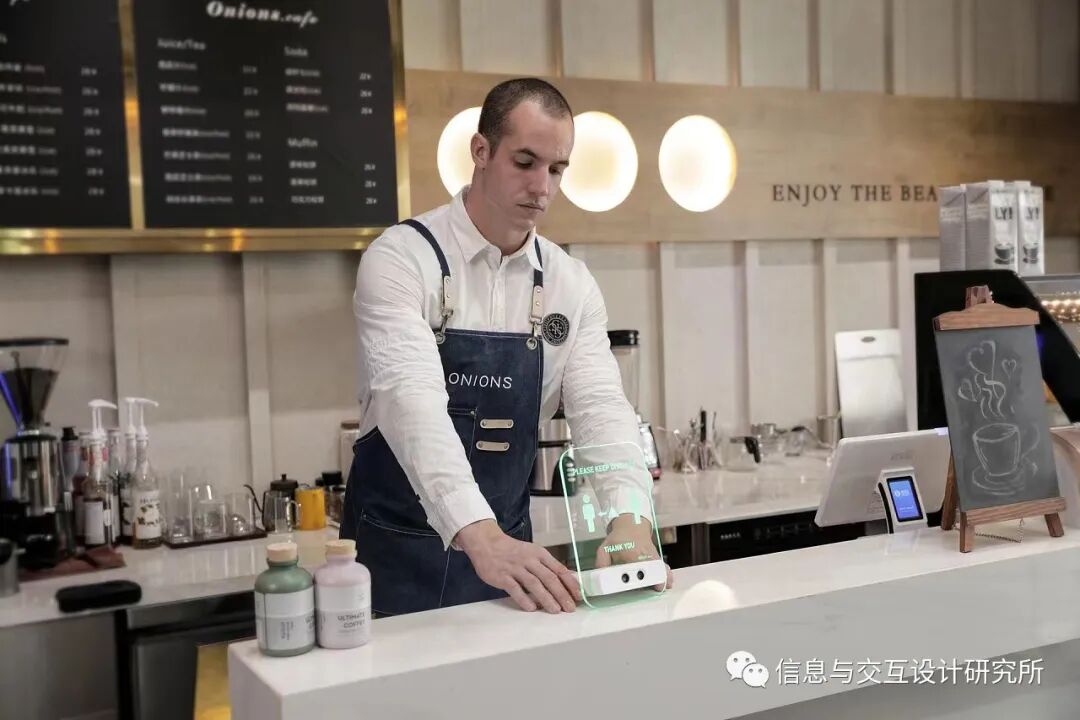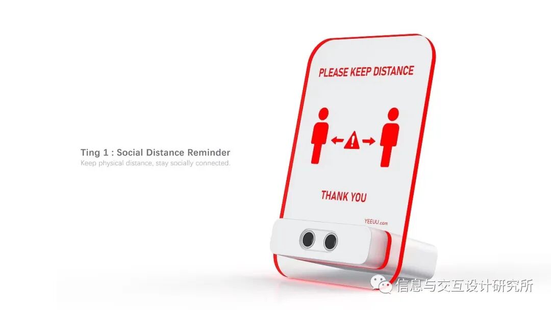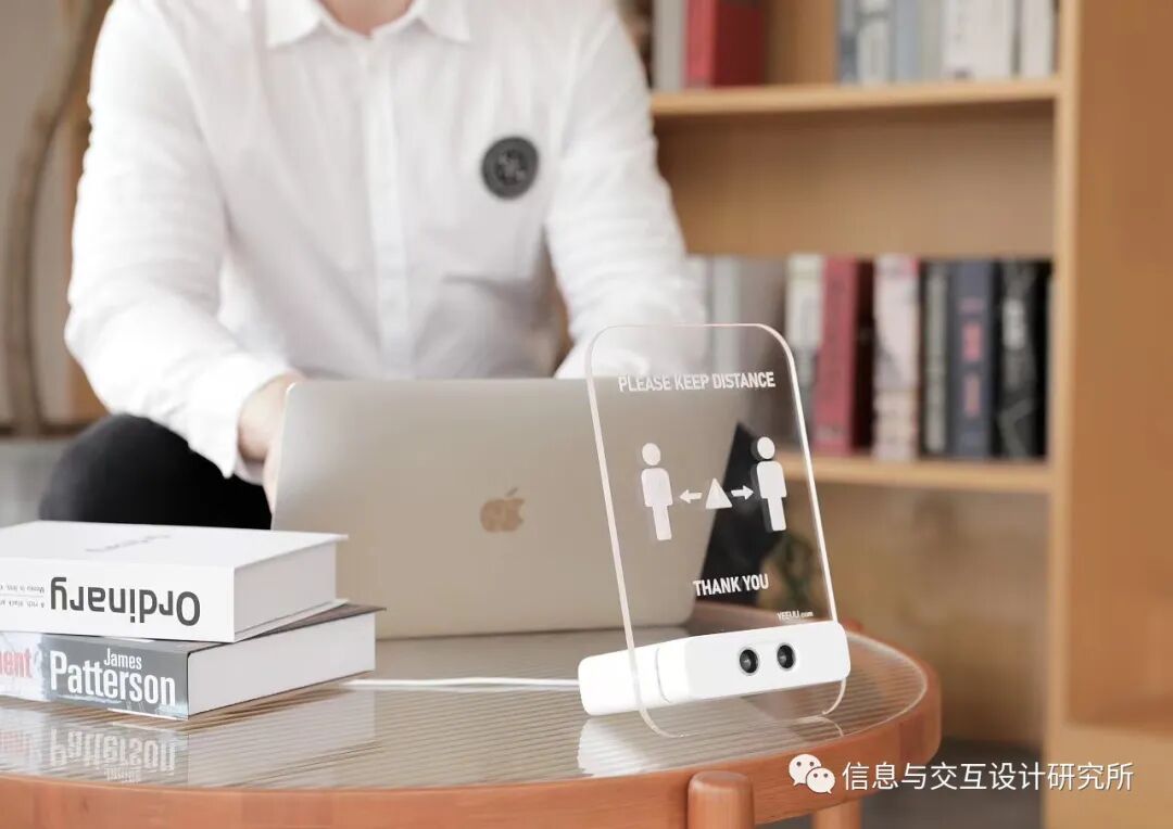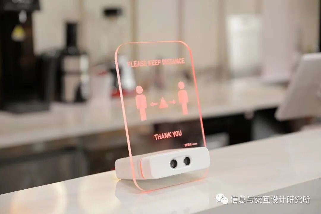 这在国内确实不能感同身受到,加上疫情期间,对公共场合的距离敏感性更高,所以有了这款产品的设计,面对吧台等场所,通过超声波感应距离,距离太近会有灯光提醒,善意的警告保持安全距离。
