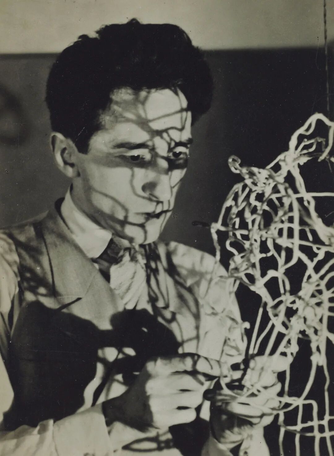 Jean Cocteau et son autoportrait en fil de fer, c. 1925