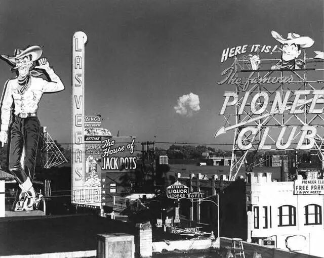 1955 年,从拉斯维加斯市中心的弗里蒙特街看到原子试验的蘑菇云,那朵云距离城市约 65英里