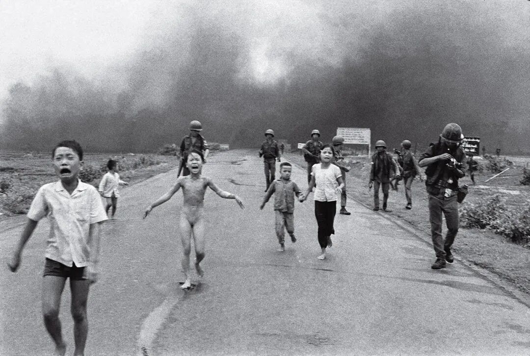 南越的一架飞机在搜寻越共藏身地时,故意向平民投下了凝固汽油弹,在空袭中严重烧伤的小女孩赤身裸体地在1号公路上奔跑。这张照片在世界上引起了巨大的反战浪潮。